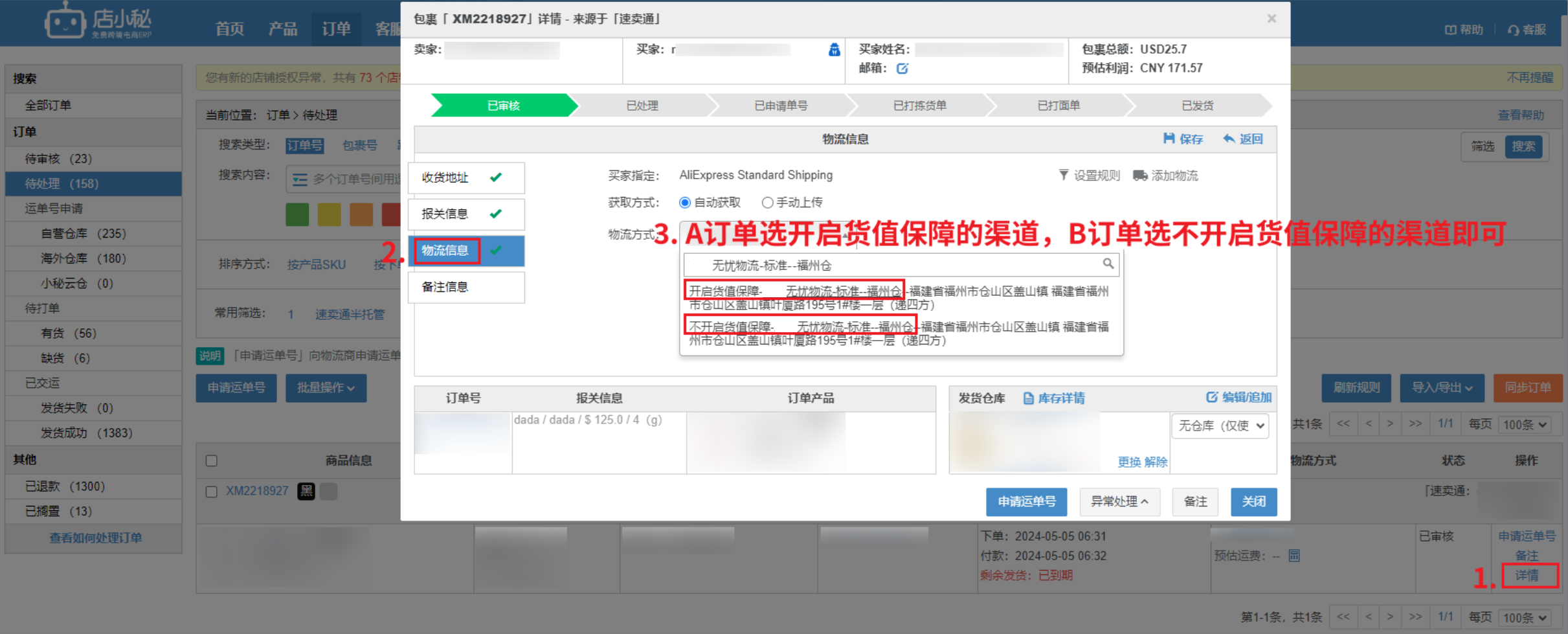 第二步:针对不同订单,分别选择开启货值保障、不开启货值保障的渠道,申请单号即可