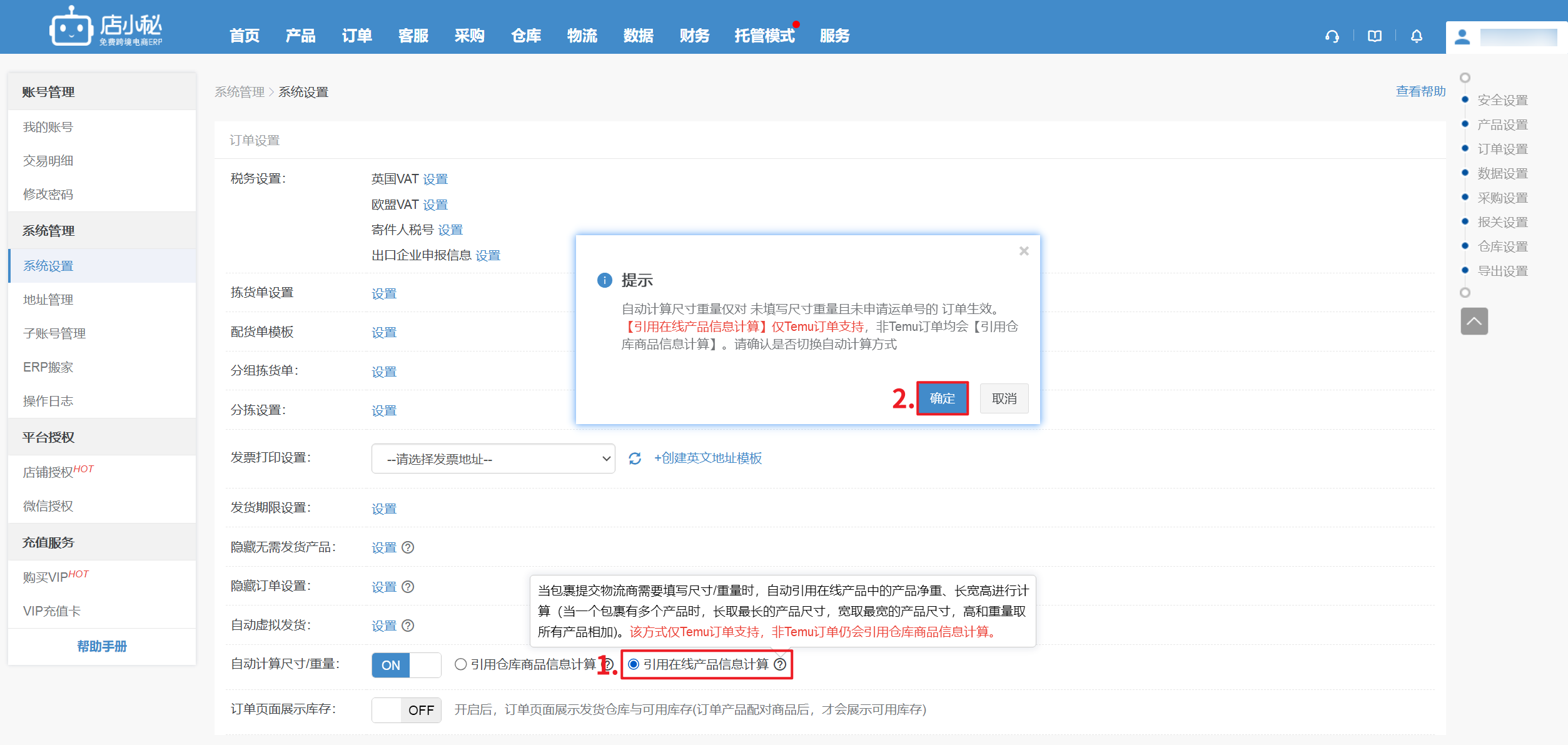 【登录小秘主账号—系统设置—订单设置—开启自动计算重量/尺寸—确定—引用在线产品信息计算—确定】