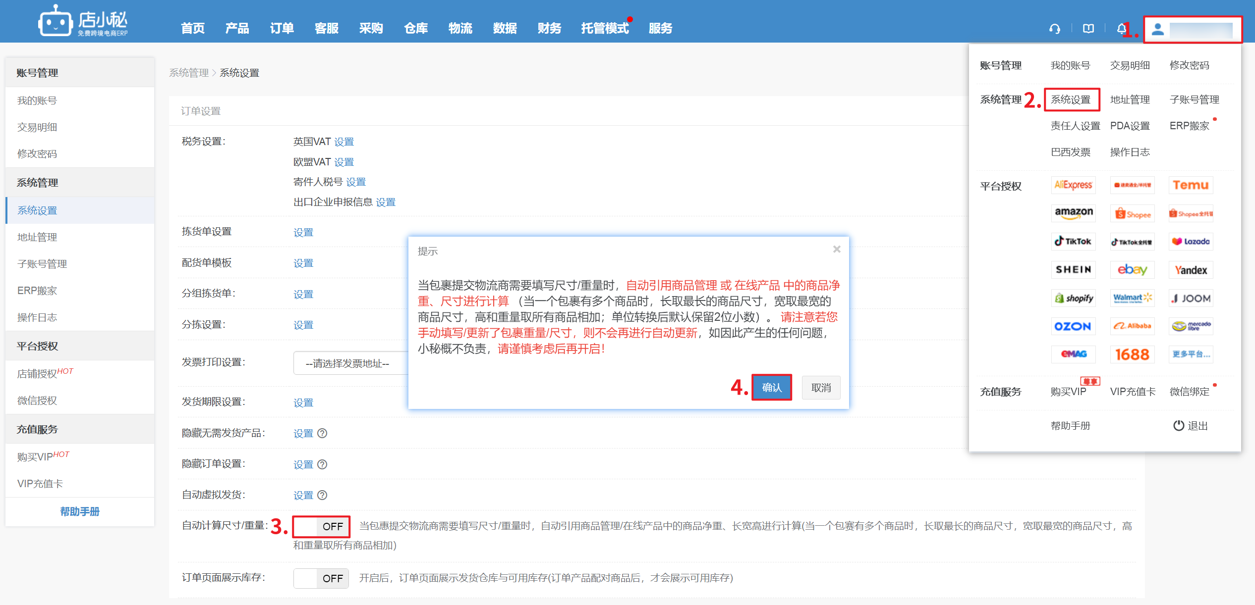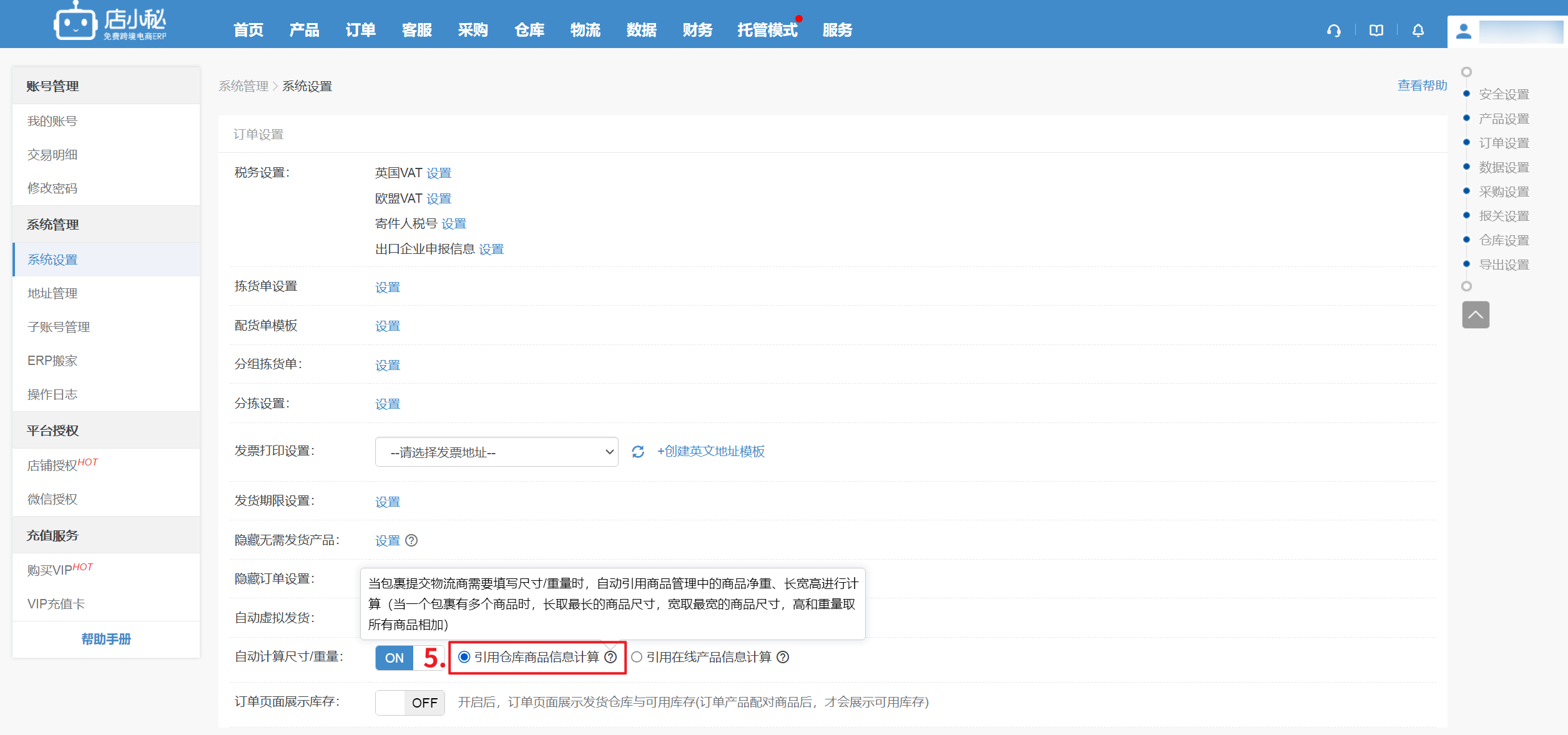 【登录小秘主账号—系统设置—订单设置—开启自动计算重量/尺寸—确定—引用仓库商品信息计算】