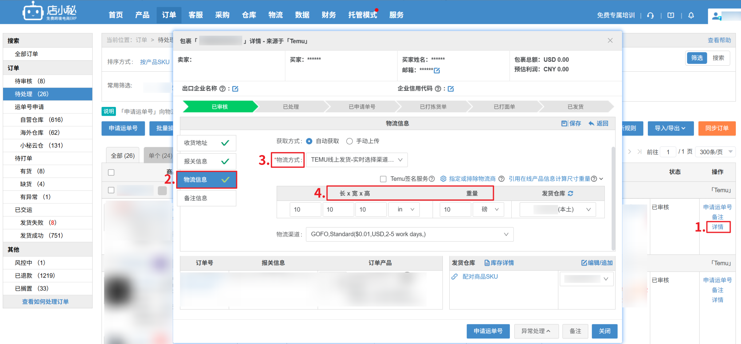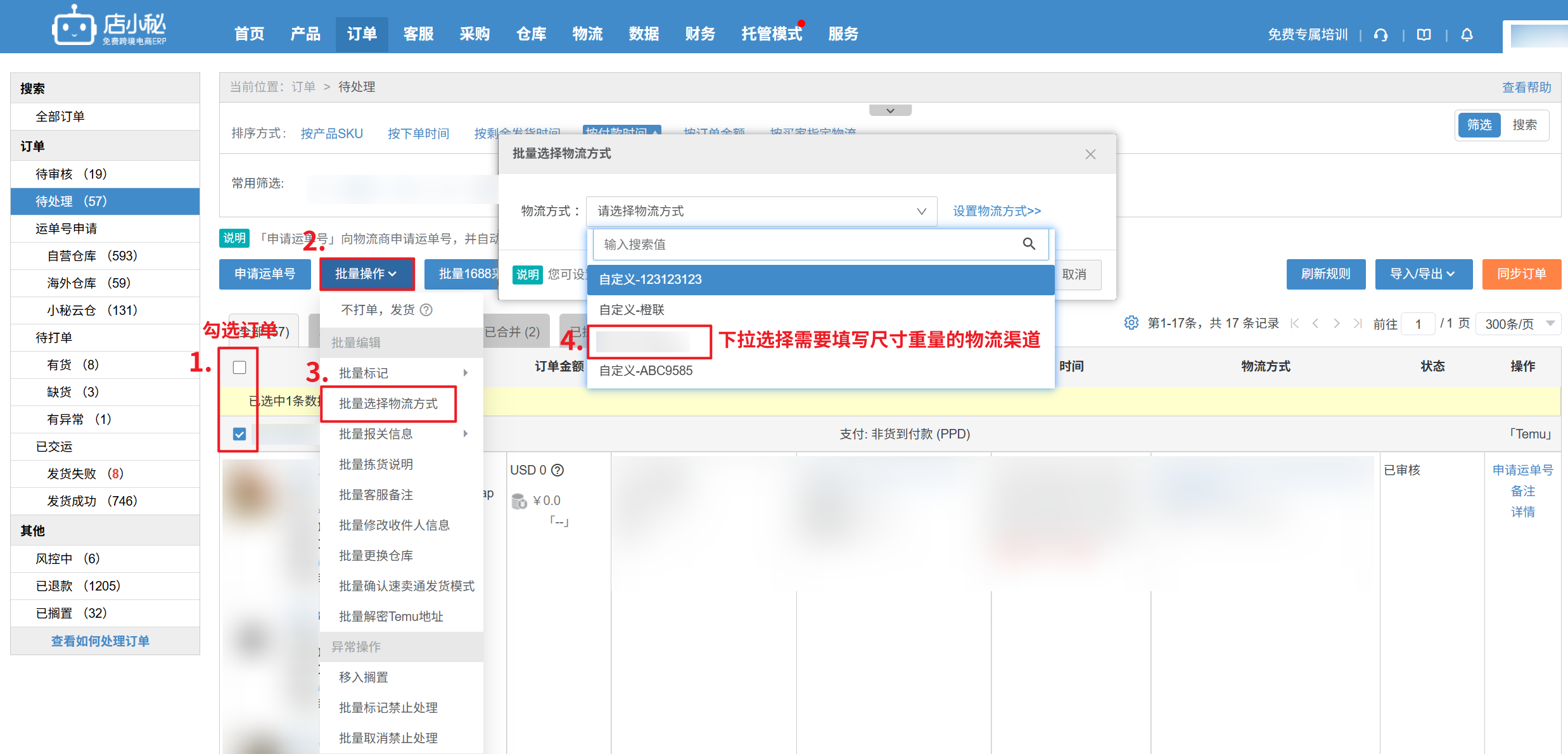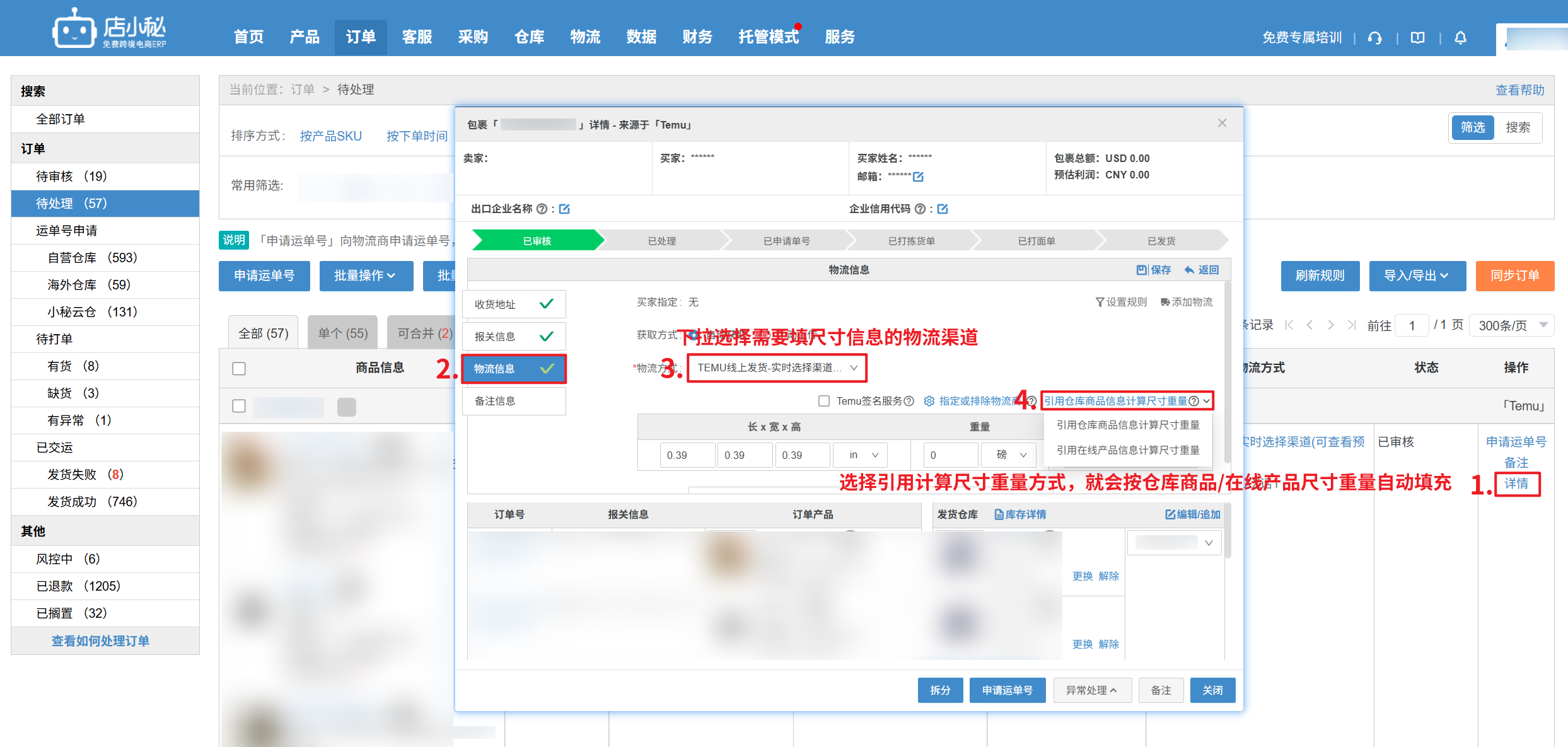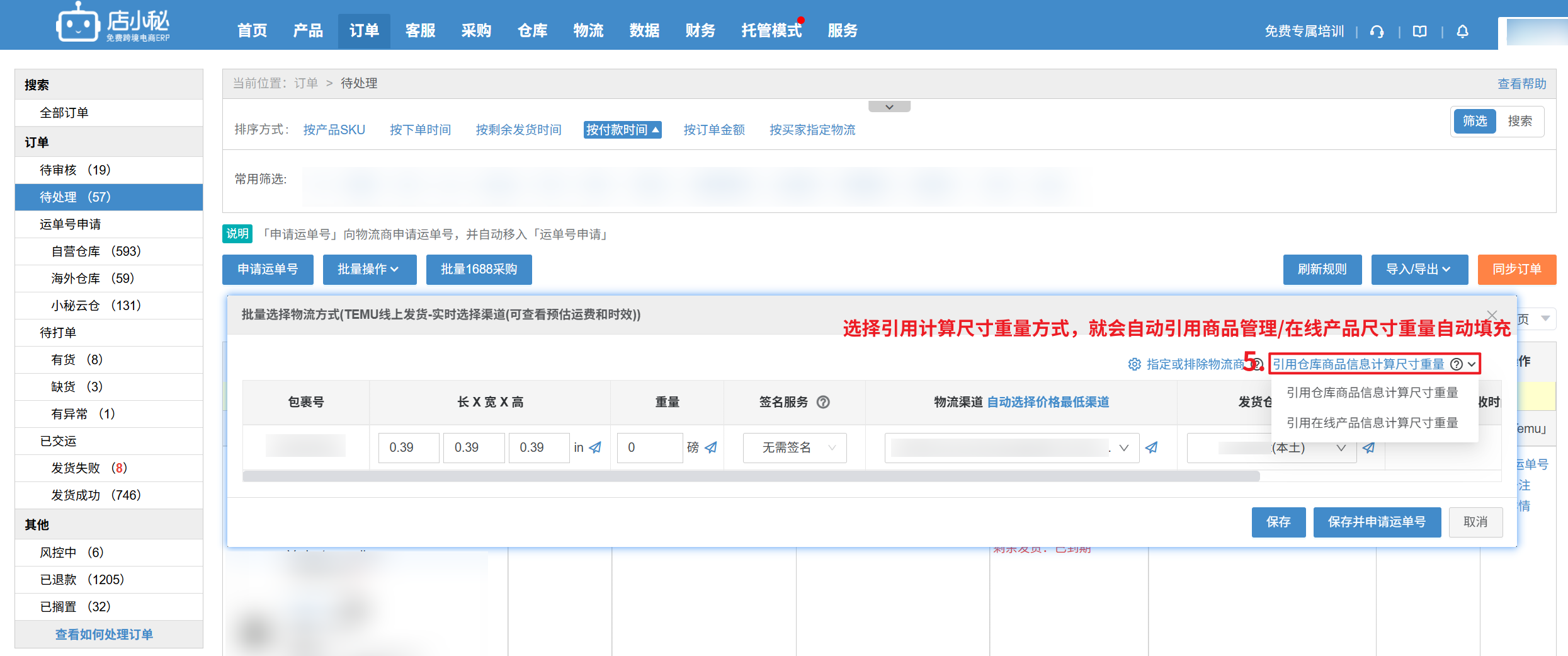 2、批量操作:【勾选订单—批量选择物流方式—选择物流渠道—选择计算重量尺寸方式,即可引用商品管理/在线产品信息】