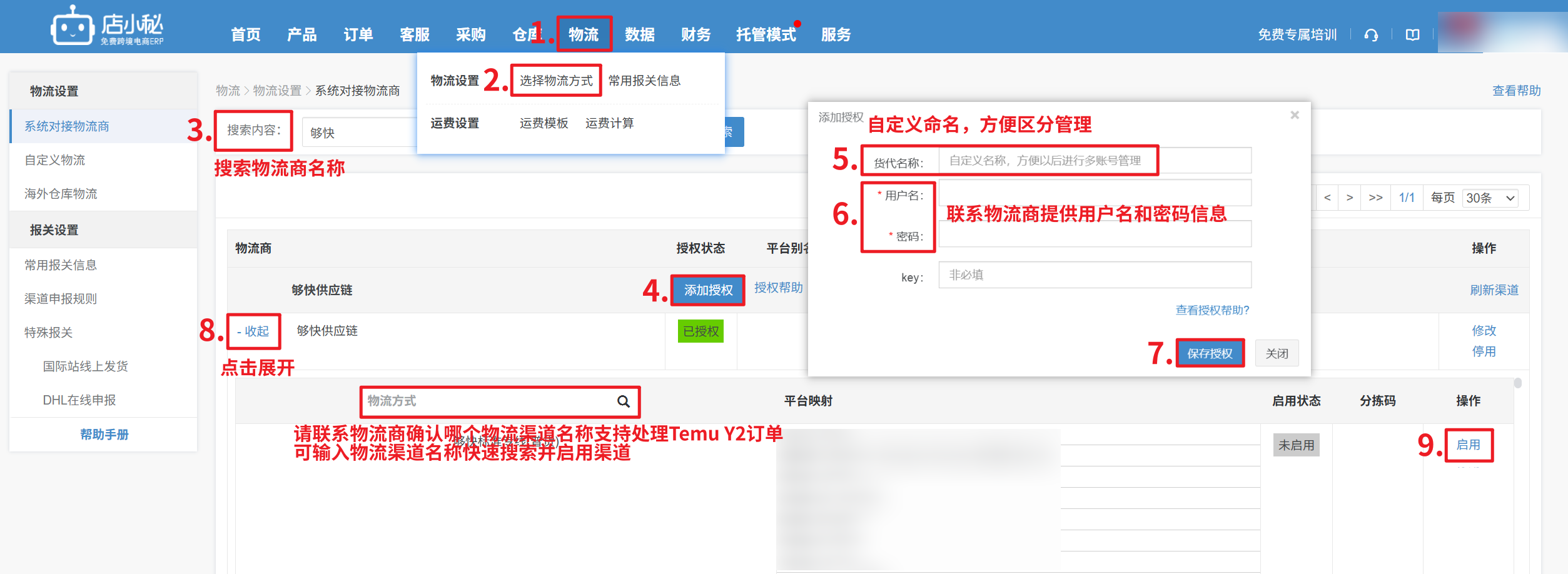 第一步:【物流—选择物流方式—搜索物流商名称—添加授权—自定义货代名称—展开—选择物流渠道—启用】