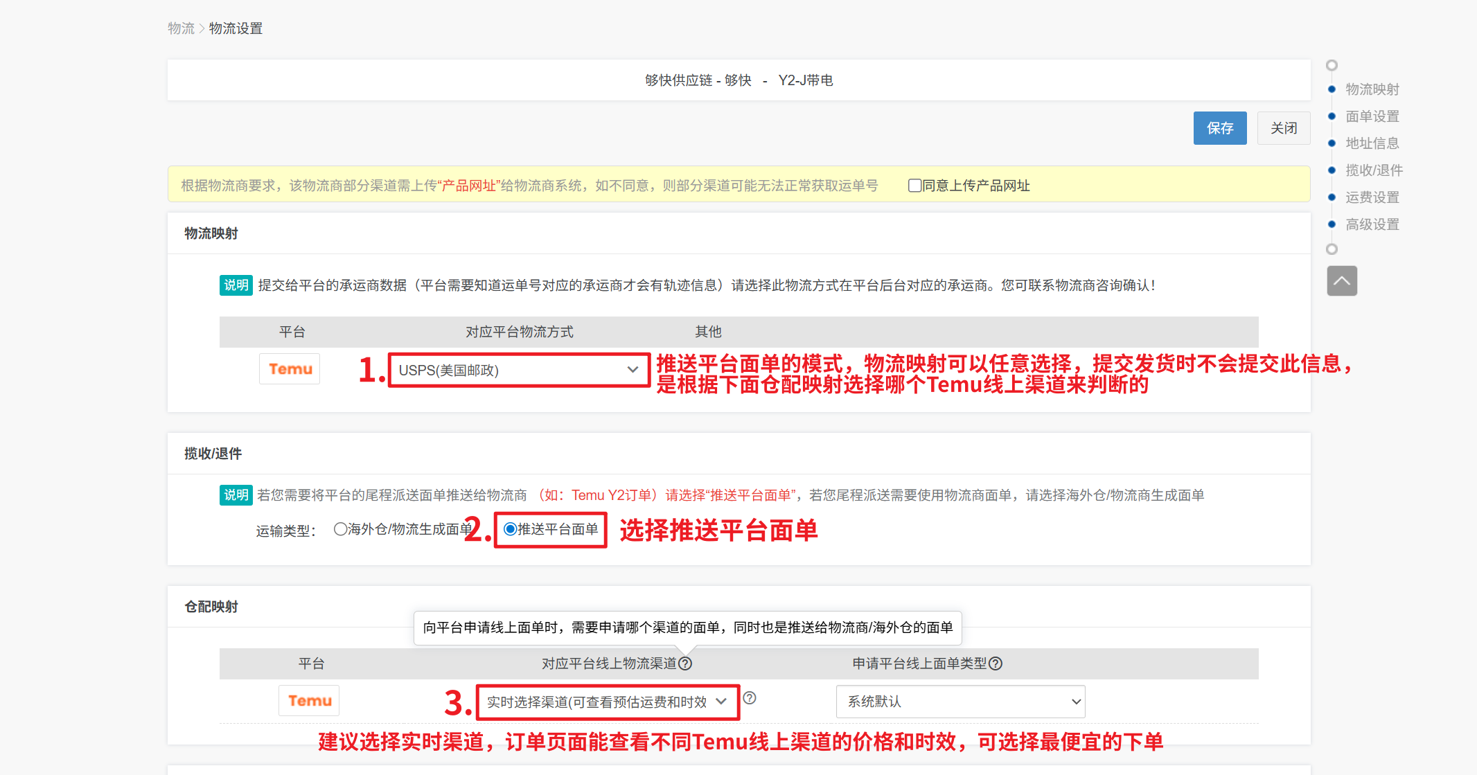 2、仓配映射:选择Temu对应的线上物流渠道