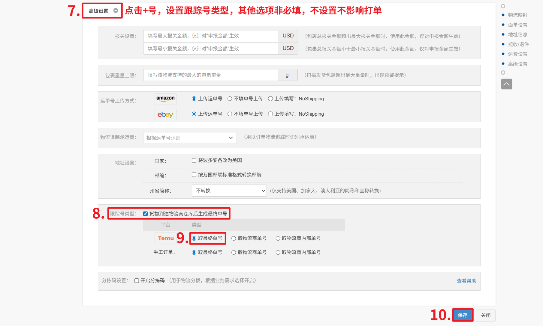 4、高级设置—跟踪号类型:勾选【货物到达物流商仓库后生成最终单号】,单号类型选择【取最终单号】