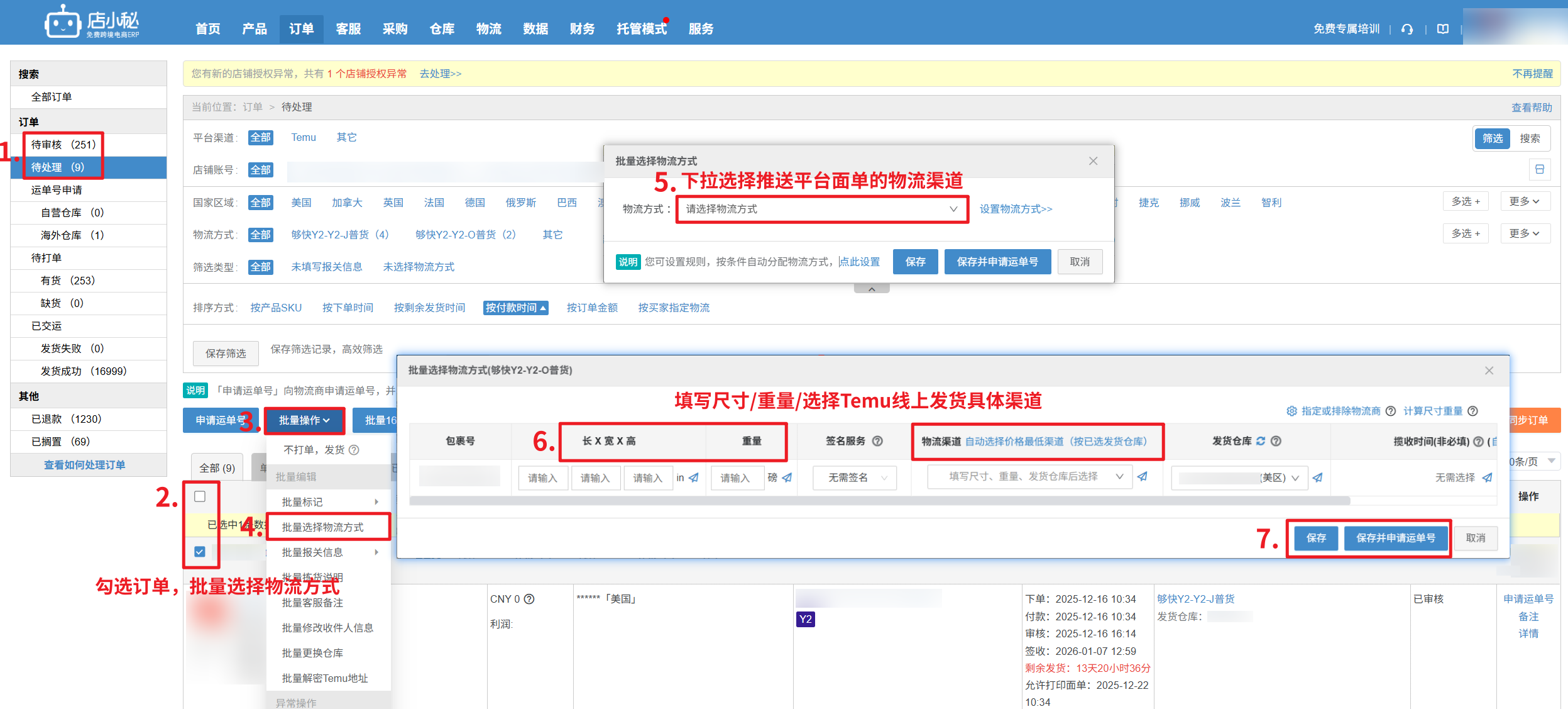 【待审核/待处理订单状态—勾选订单—批量操作—批量选择物流方式—选择物流方式—填写尺寸/重量/选择物流渠道—保存并申请运单号】