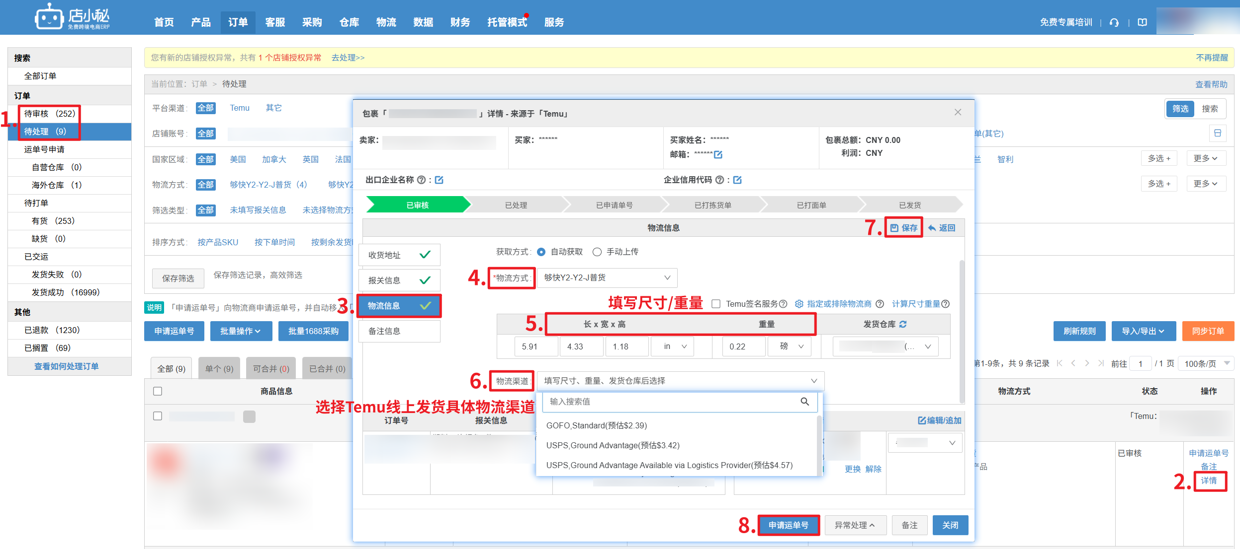 【待审核/待处理订单状态—订单详情—物流信息—右上角编辑—选择物流方式—填写尺寸/重量/选择具体渠道—保存—申请运单号】
