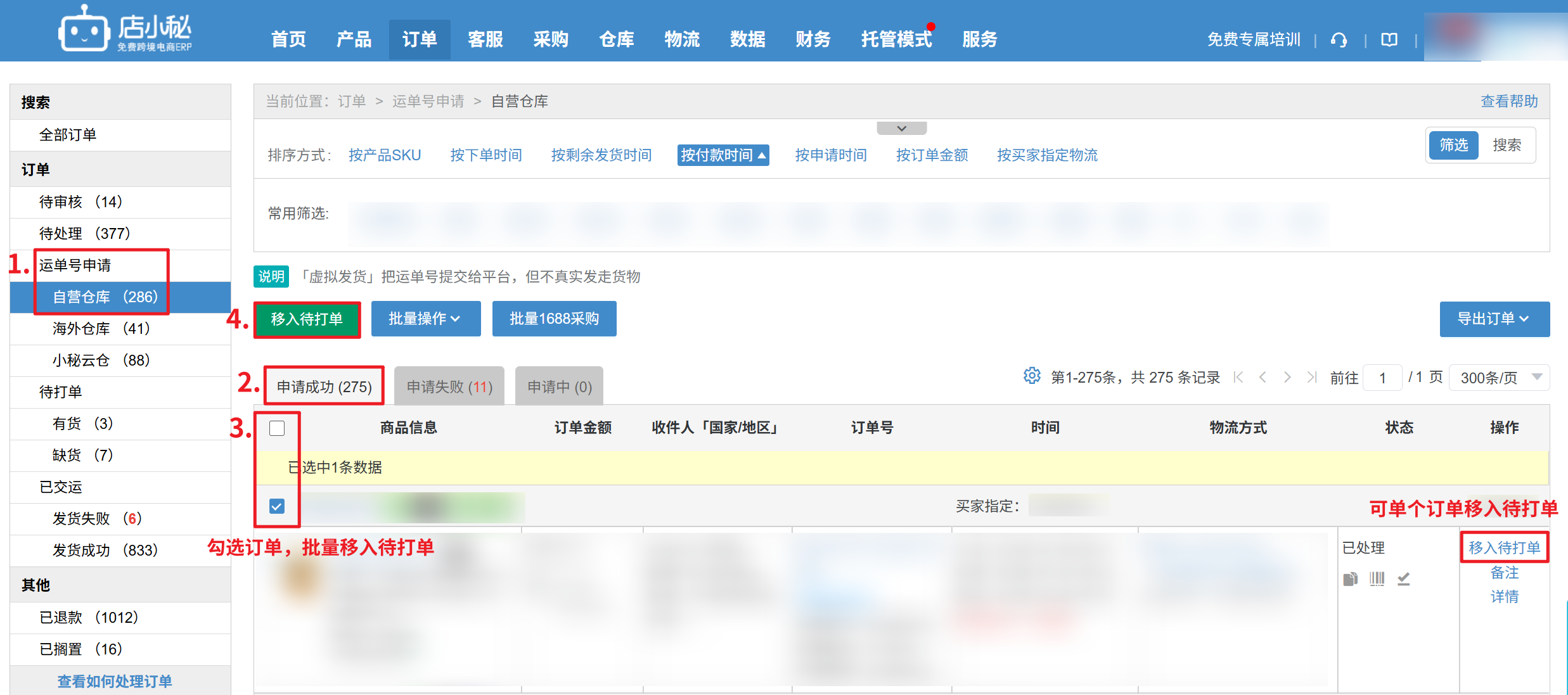第四步:【运单号申请成功状态—勾选订单—单个/批量移入待打单—批量打印—打印面单寄出—同时订单会进入补录单号的流程中】