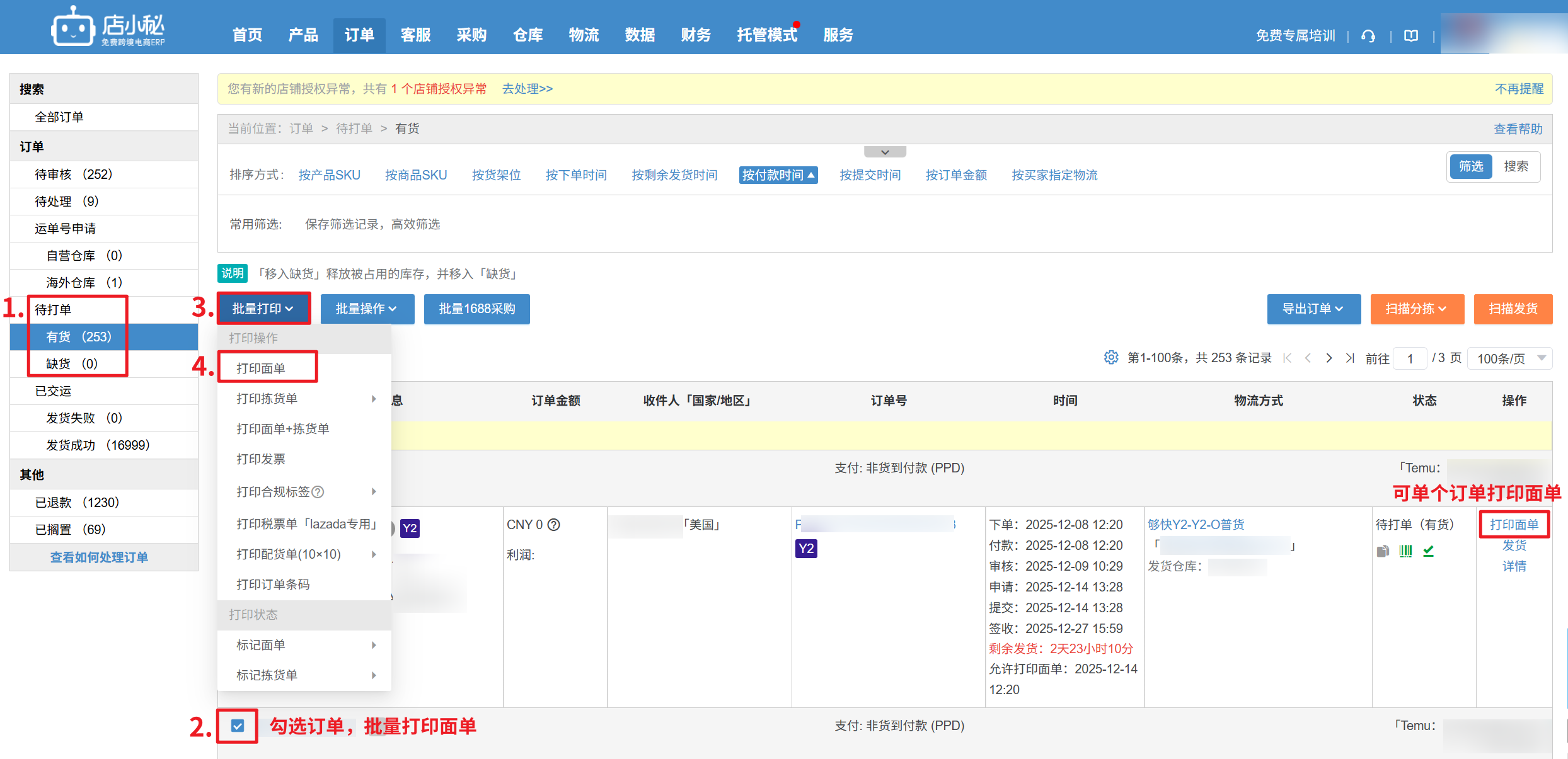 2、多个订单批量操作:
