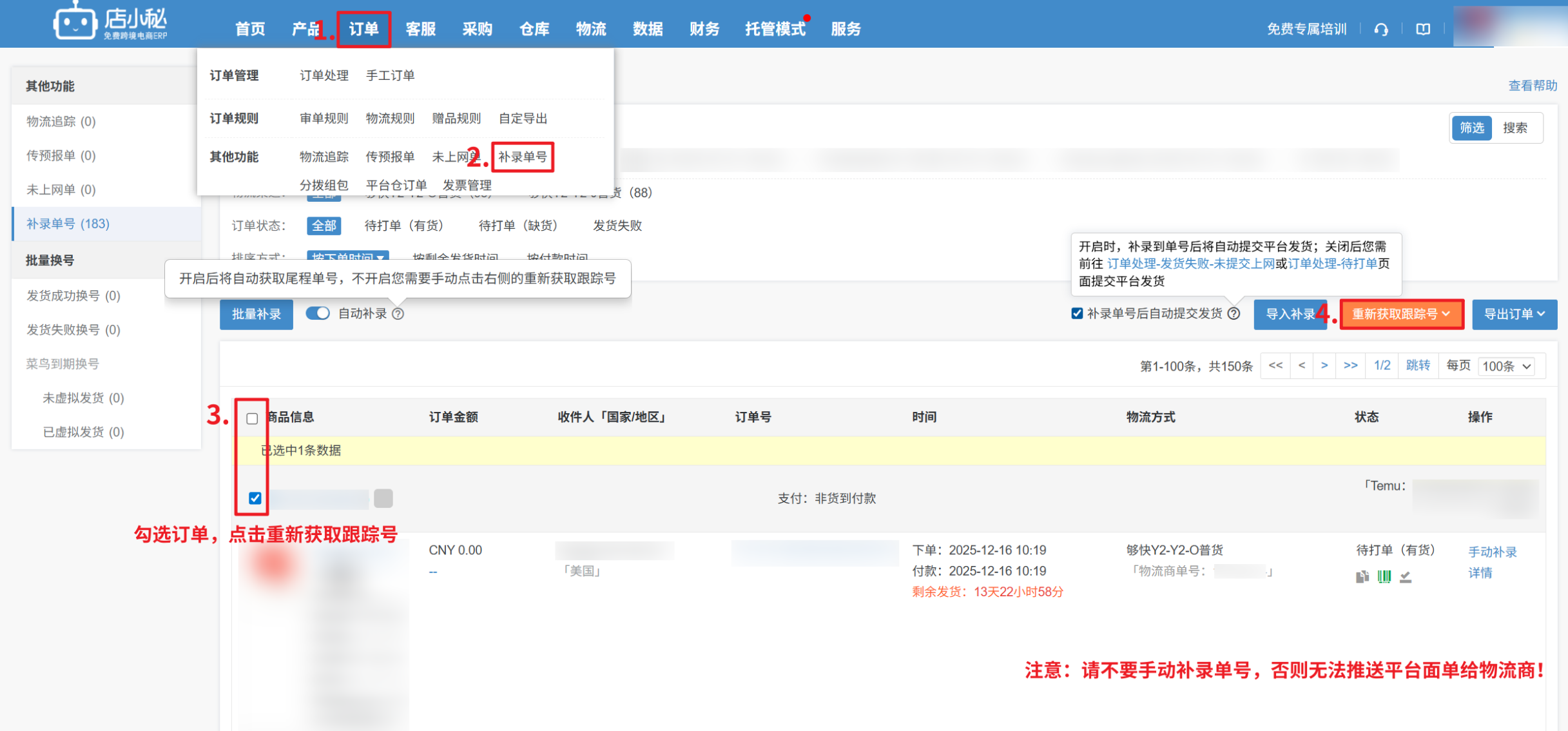 【2】补录单号流程中,请不要【手动补录】单号,否则会导致系统无法自动推送平台面单给物流商