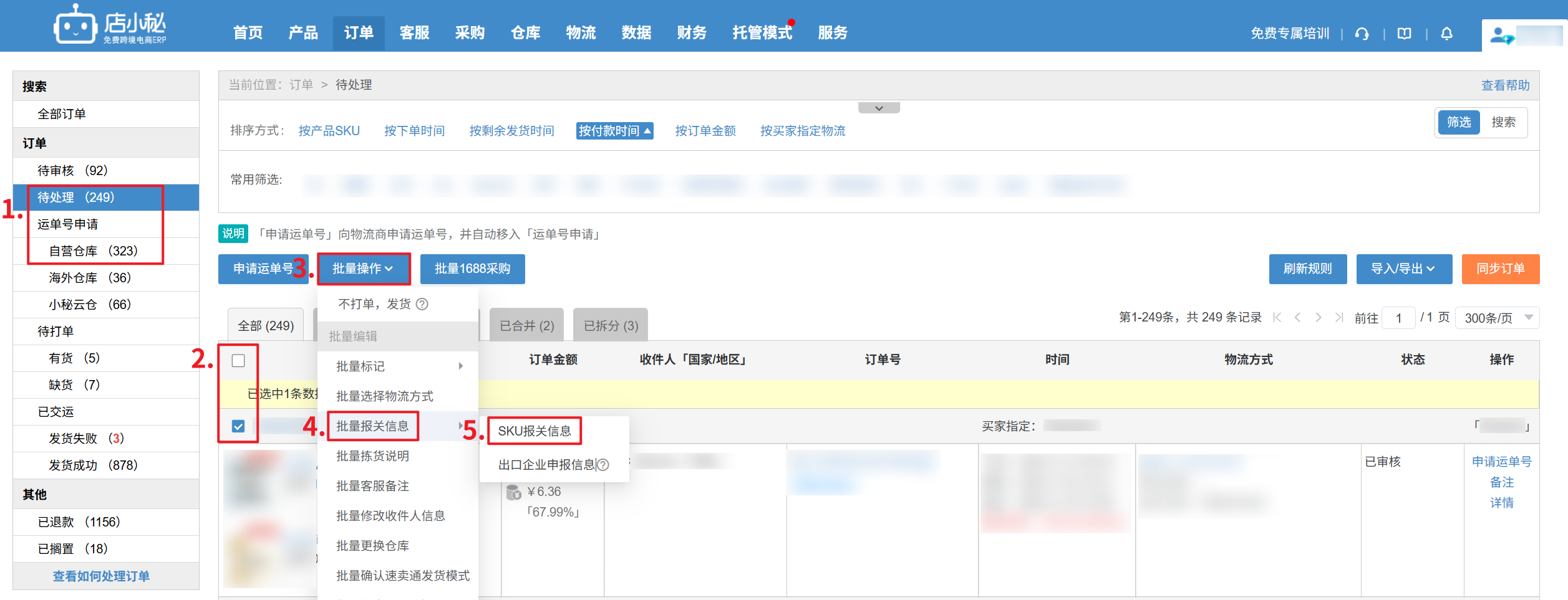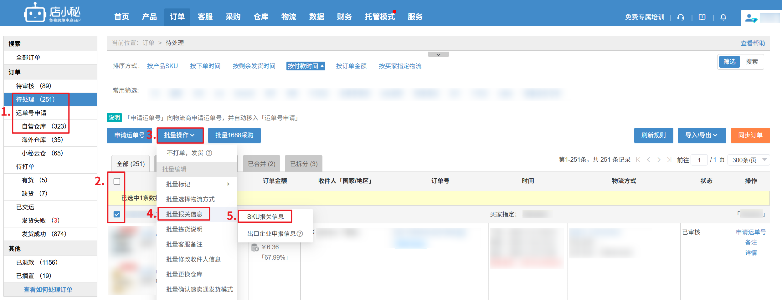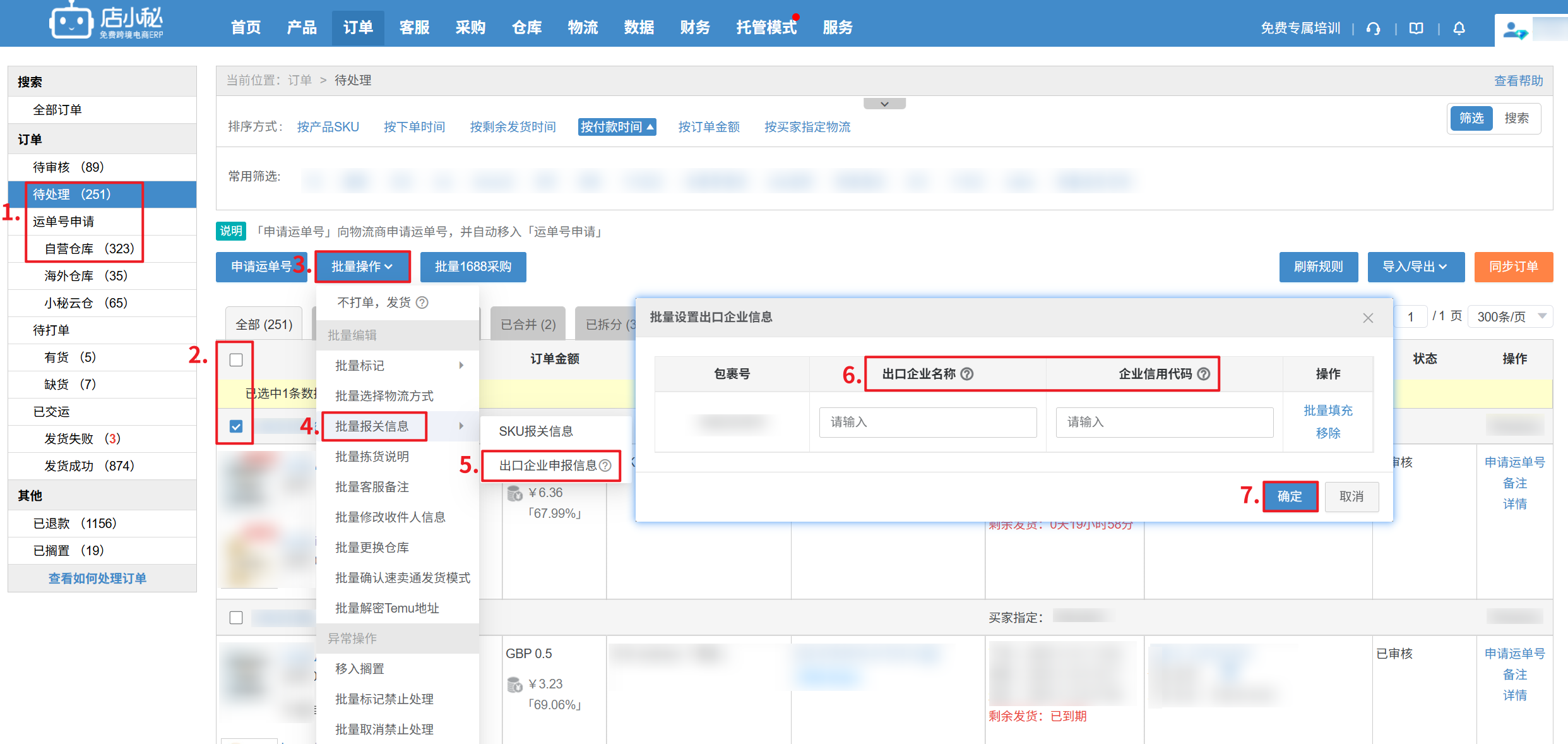 2、批量操作:【待处理/运单号申请失败订单状态—勾选订单—批量操作—批量报关信息—出口企业申报信息—输入信息—确定】