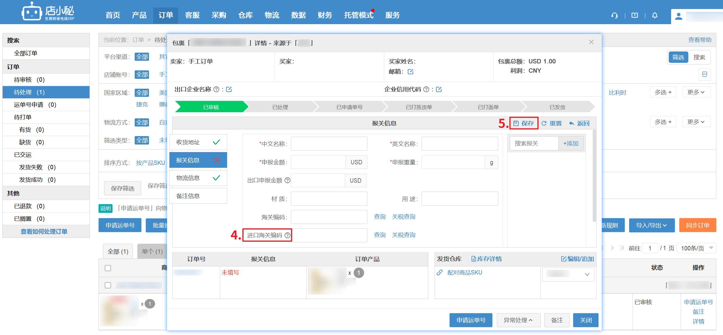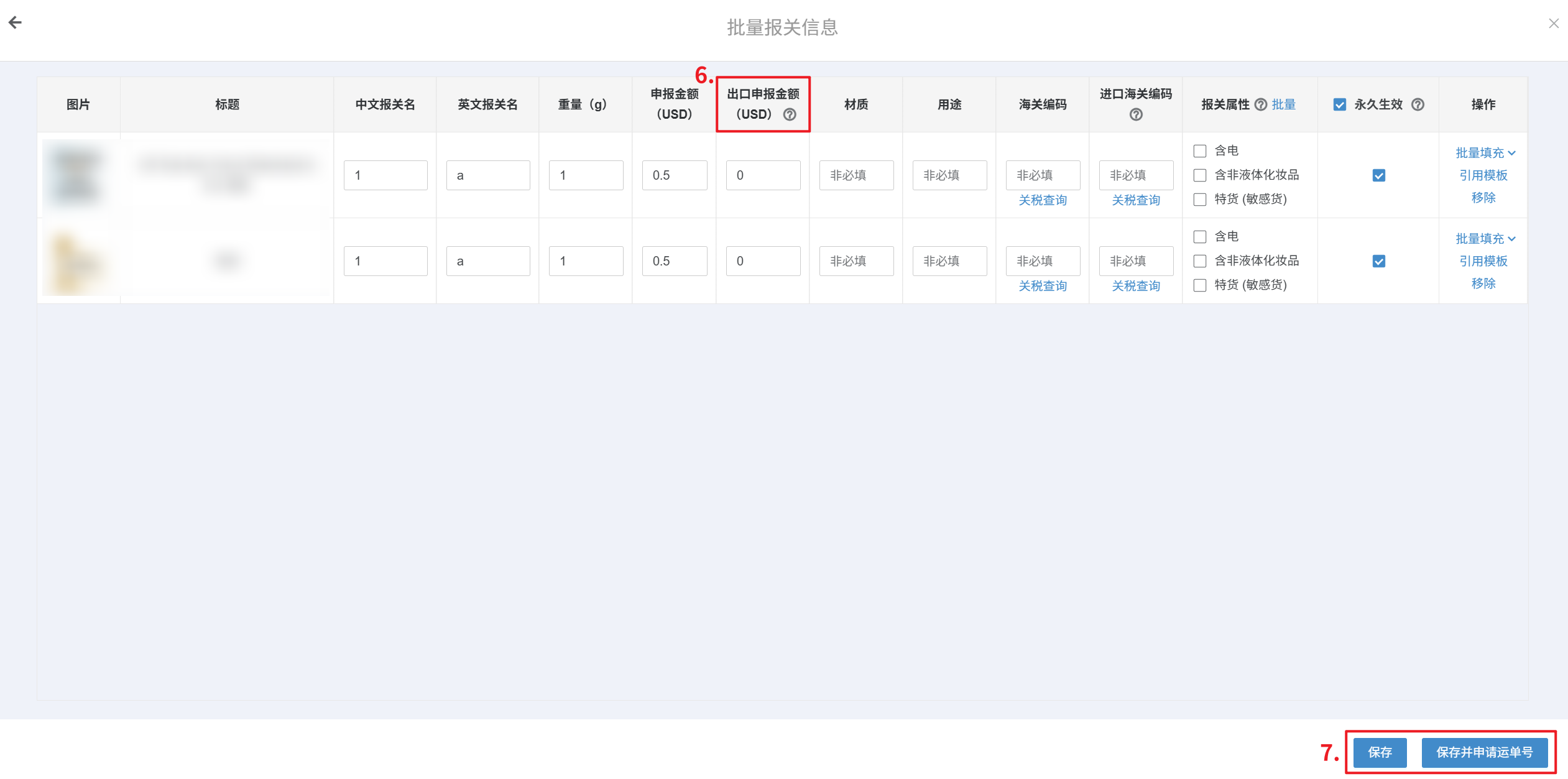 2、批量操作:【待处理/运单号申请失败订单状态—勾选订单—批量报关信息—SKU报关信息—填写出口申报金额—保存】