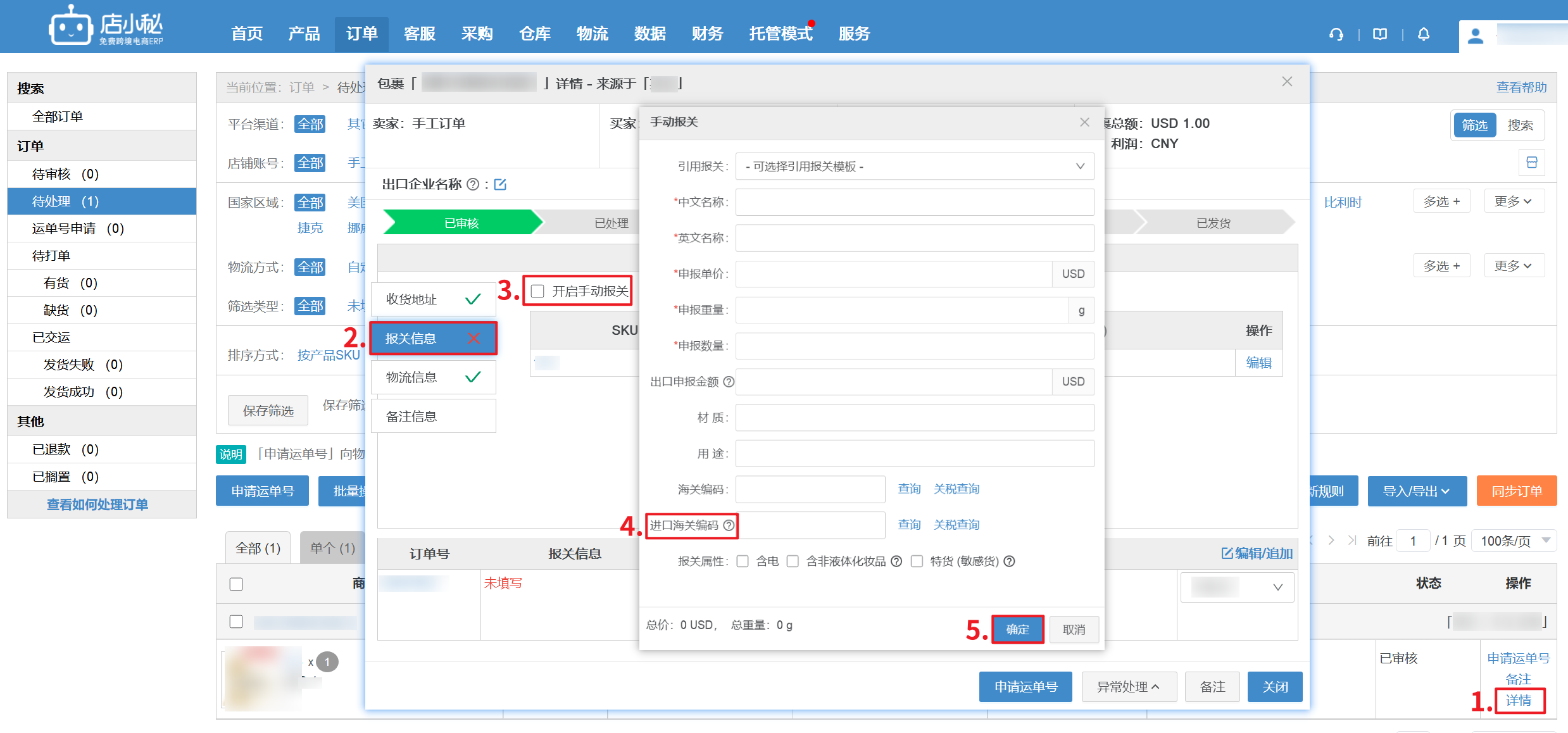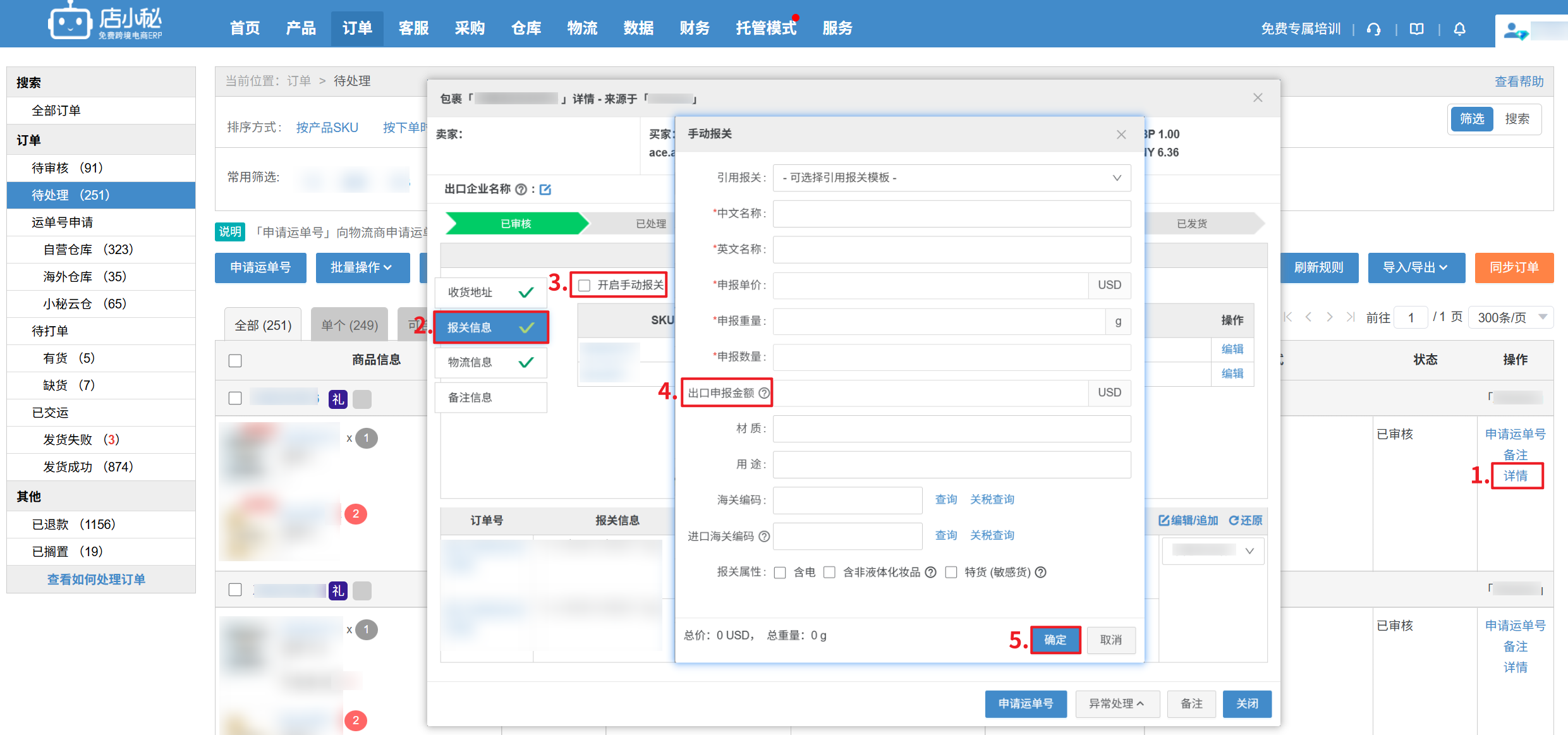 步骤:【订单详情—报关信息—手动报关—填写出口申报金额—确认】