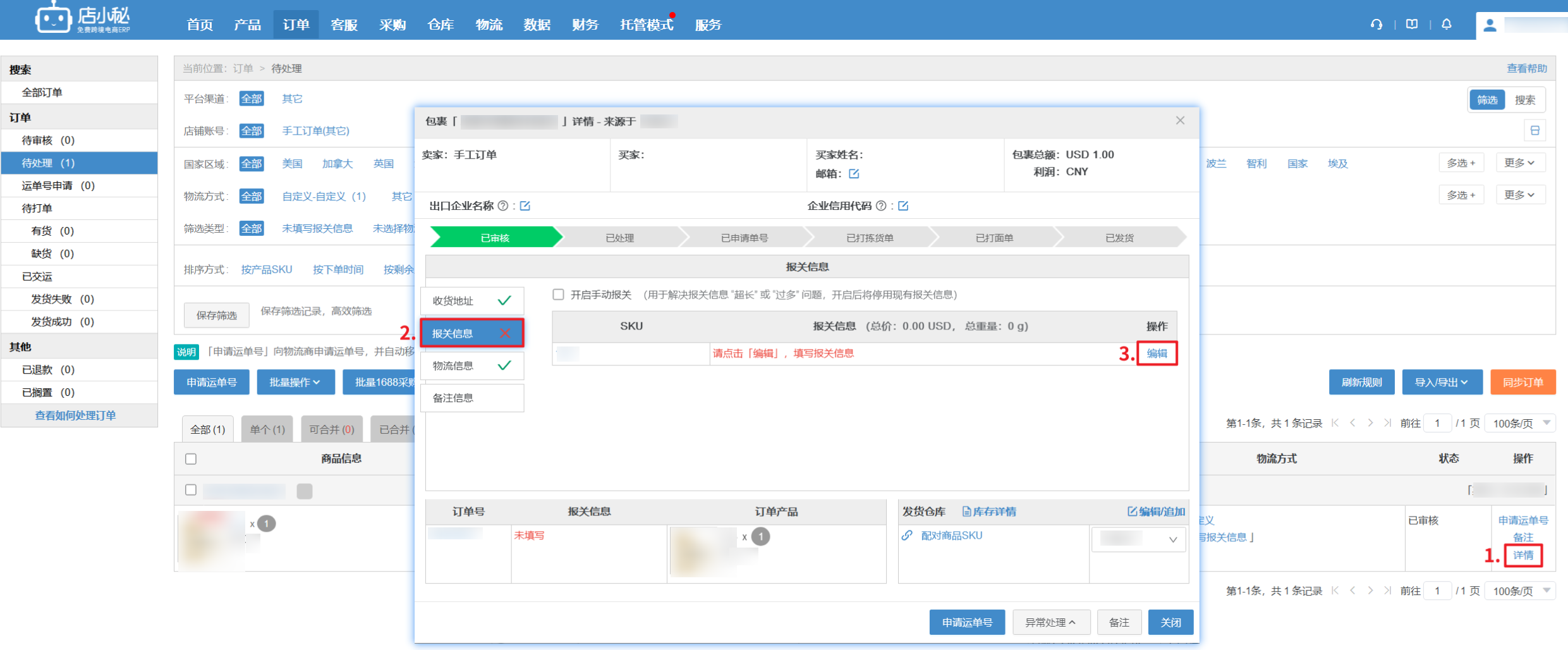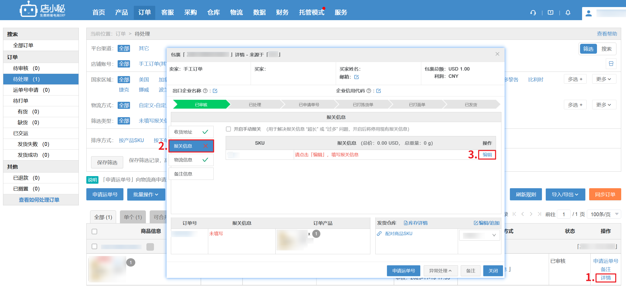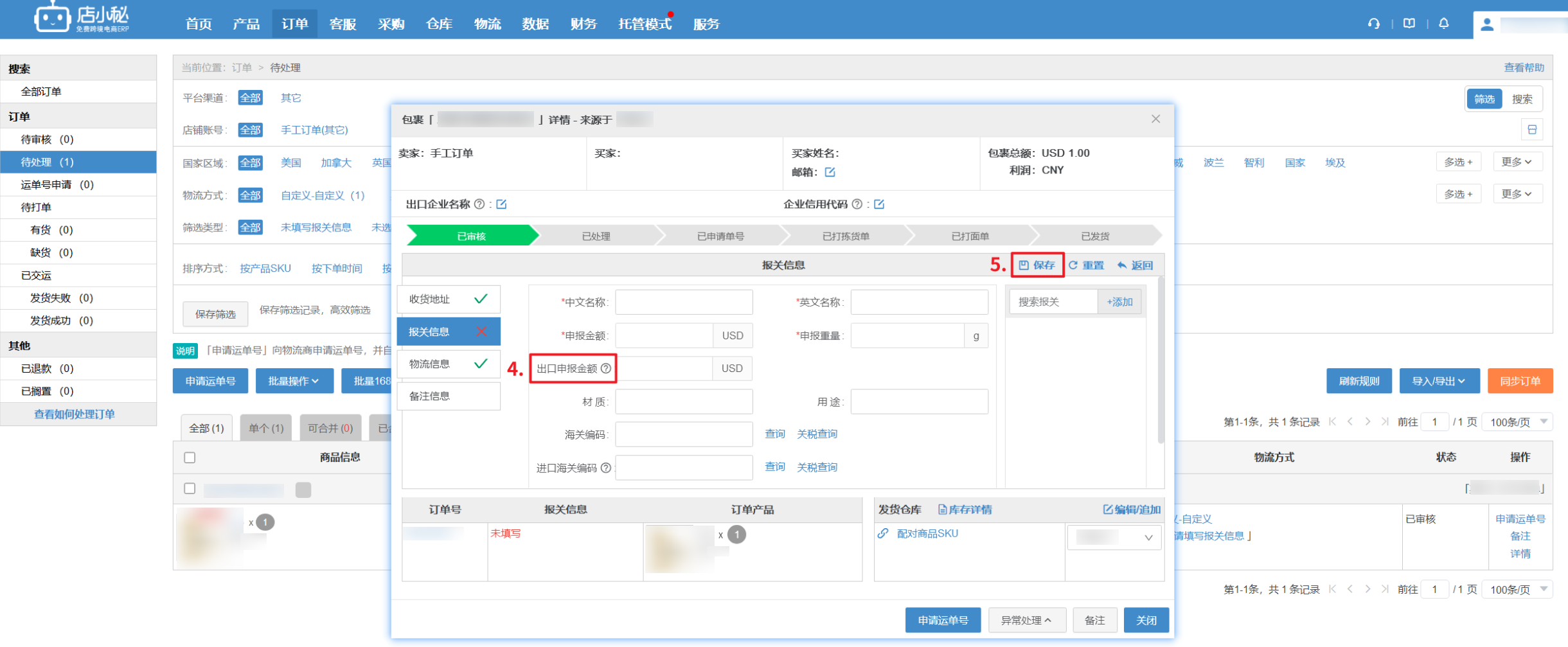1、 单个操作:【订单详情—报关信息—编辑—填写出口申报金额—保存】