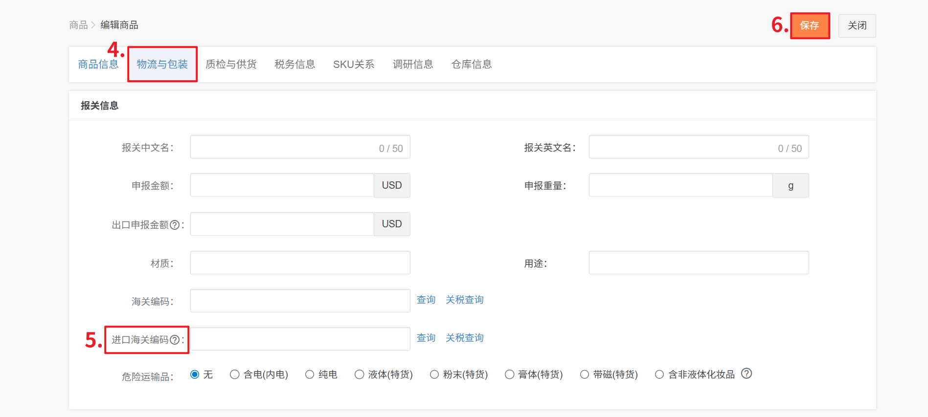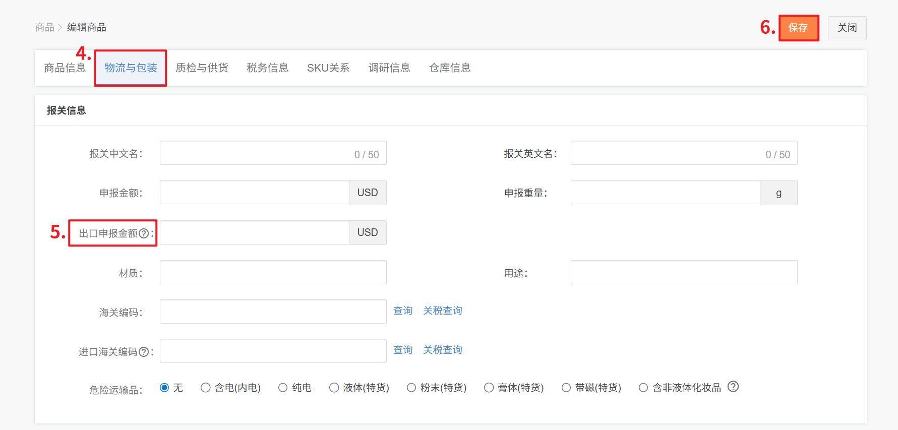 1、单个编辑:【仓库—商品管理—编辑—物流与包装—填写出口申报金额—保存】