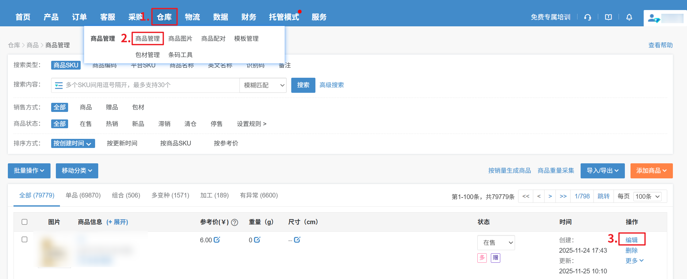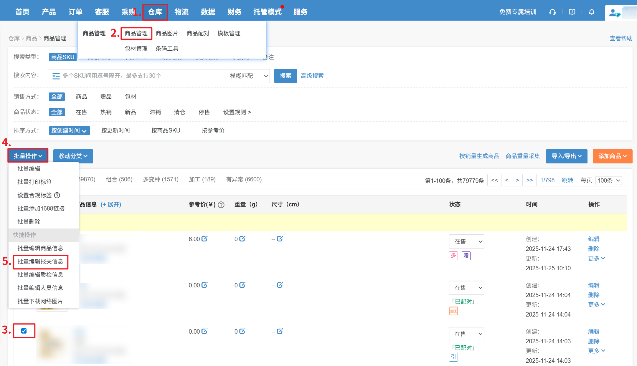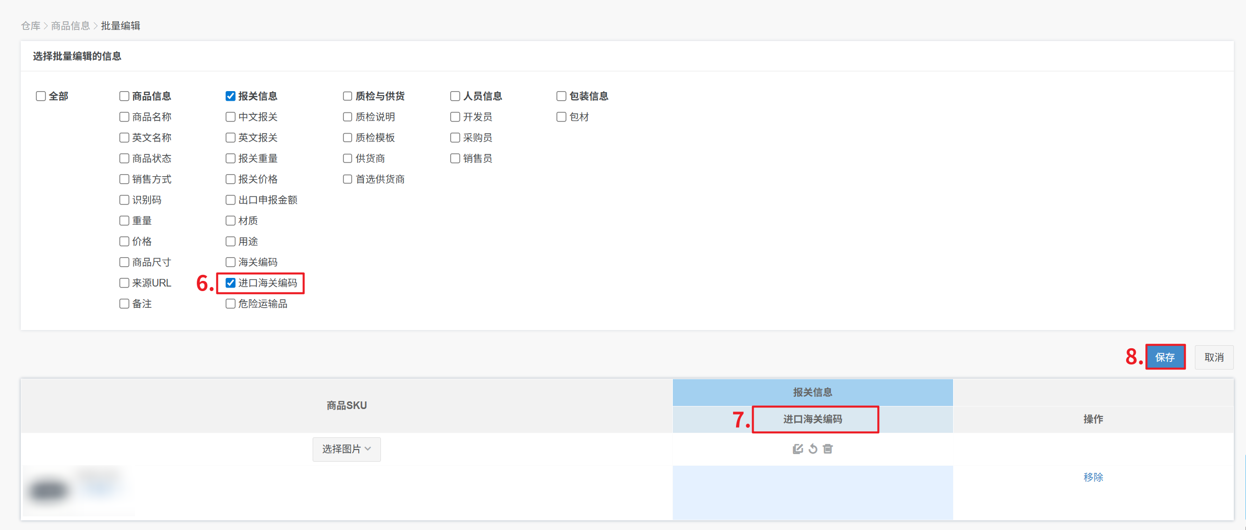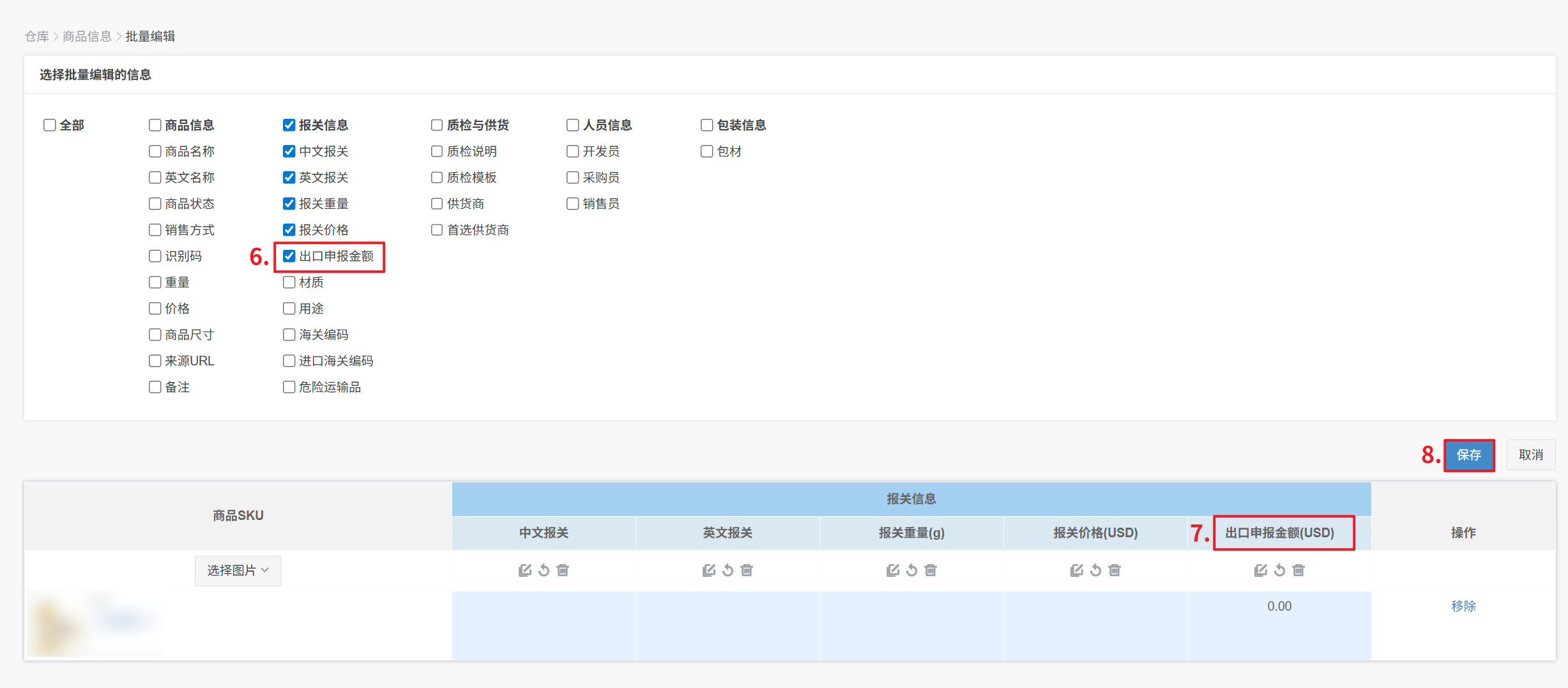 2、批量编辑:【仓库—商品管理—批量操作—批量编辑报关信息—填写出口申报金额—保存】