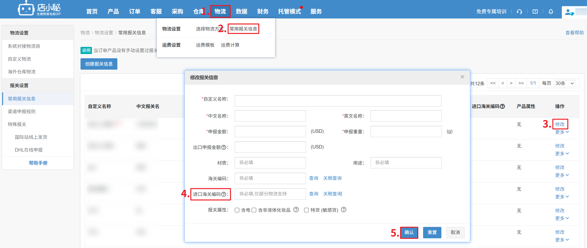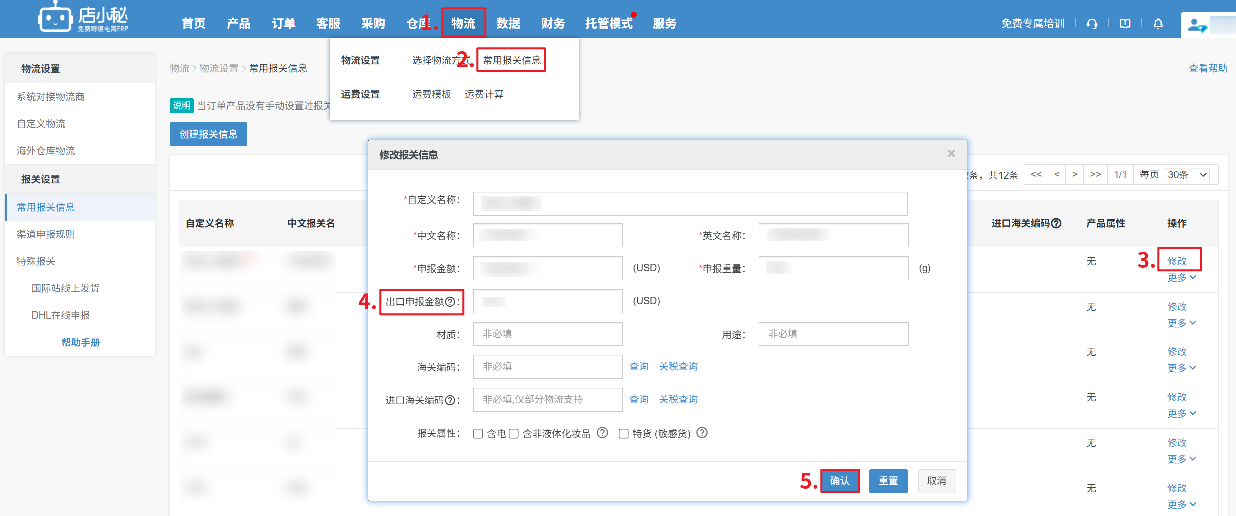 步骤:【物流—常用报关信息—修改—填写出口申报金额—确定】
