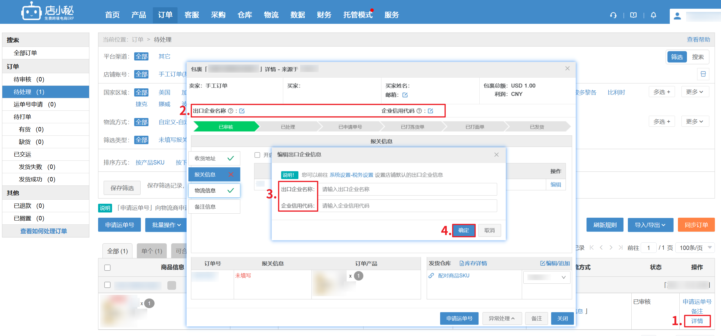 1、单个操作:【订单详情—出口企业名称、企业信用代码—编辑—输入信息—确定】