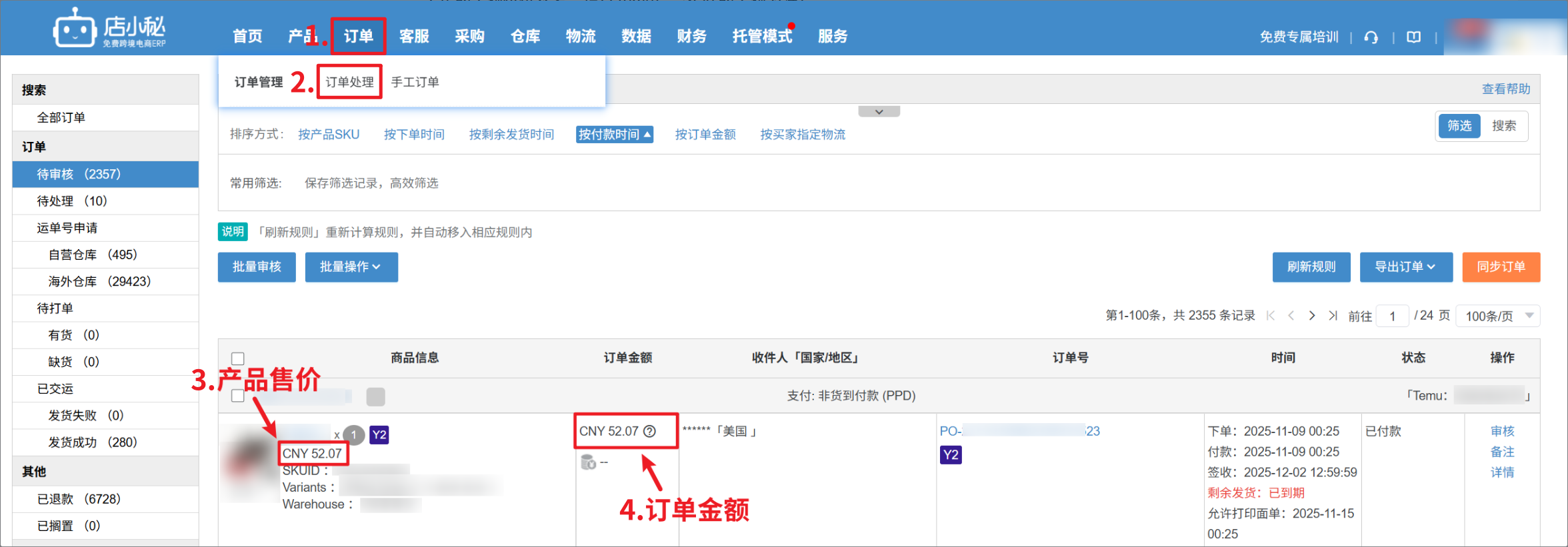 采集成功后,在店小秘订单处理列表页面,可查看对应的产品售价和订单金额