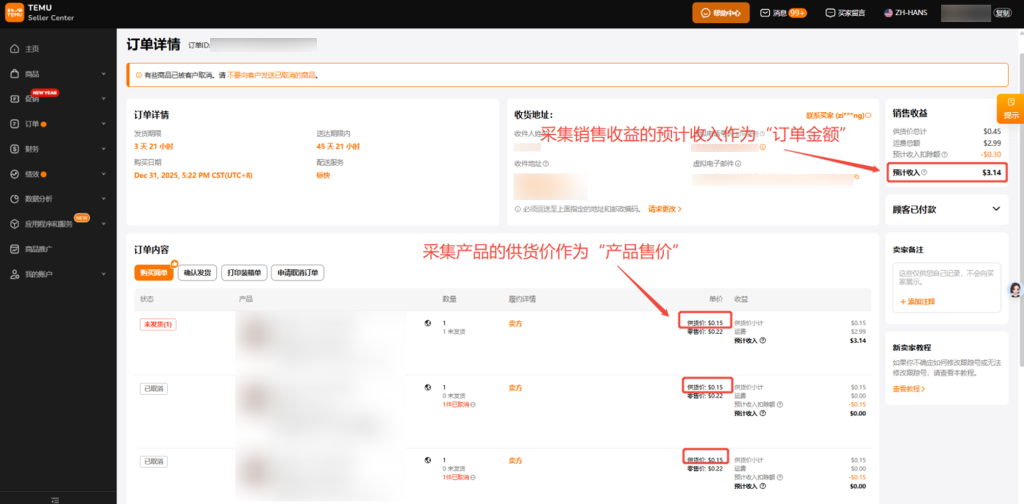 【7】Temu本土采集后台订单详情中【销售收益—预计收入】作为订单金额;采集产品的【供货价】作为产品售价