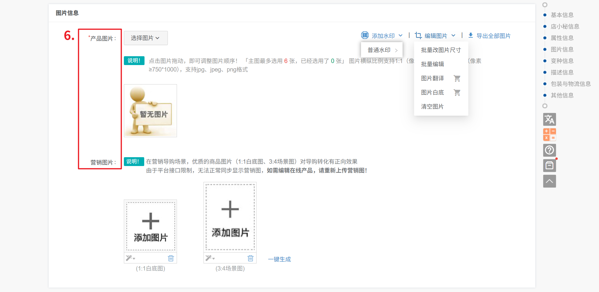 注意:1、主图最多上传6张、图片比例支持1:1(像素≥800*800)或3:4(像素≥750*1000),支持jpg、jpeg、png格式