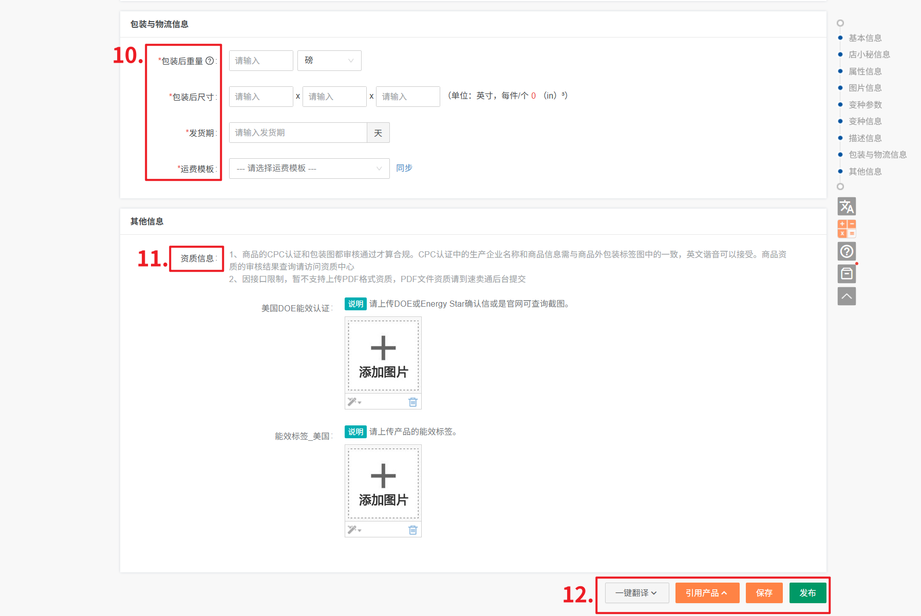 ① 产品属性:不同的产品分类,产品属性不一样,根据实际产品选择即可,带*号必填