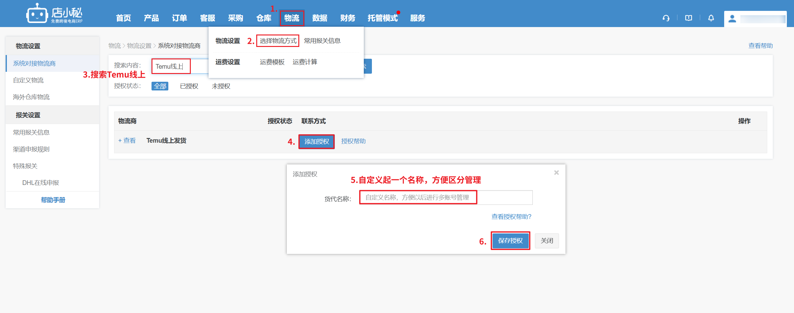 第一步:【物流—选择物流方式—系统对接物流商—搜索“Temu线上发货”—添加授权—自定义货代名称—保存授权】