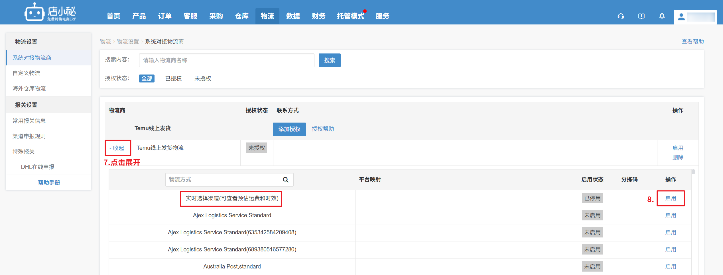 第二步:【点击展开—搜索支持推送Temu面单的具体物流名称—启用—运输类型选择:推送平台面单