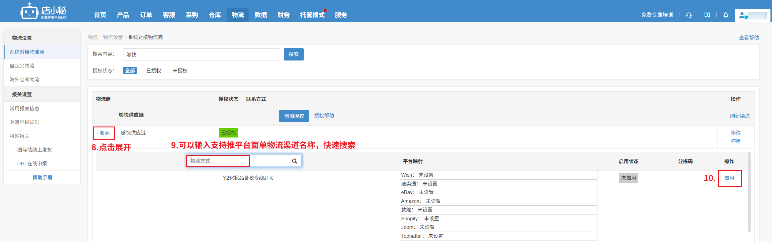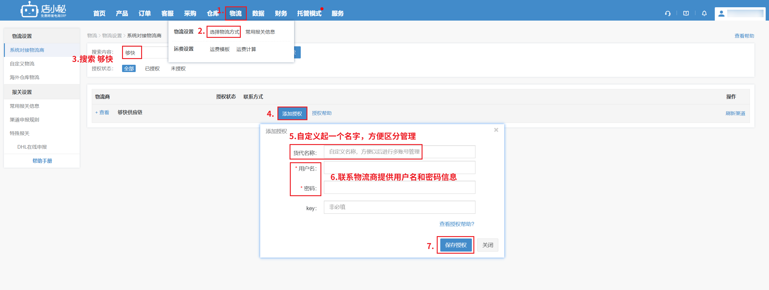 第一步:【物流—选择物流方式—系统对接物流方式—例如,搜索“够快供应链”—添加授权—自定义货代名称