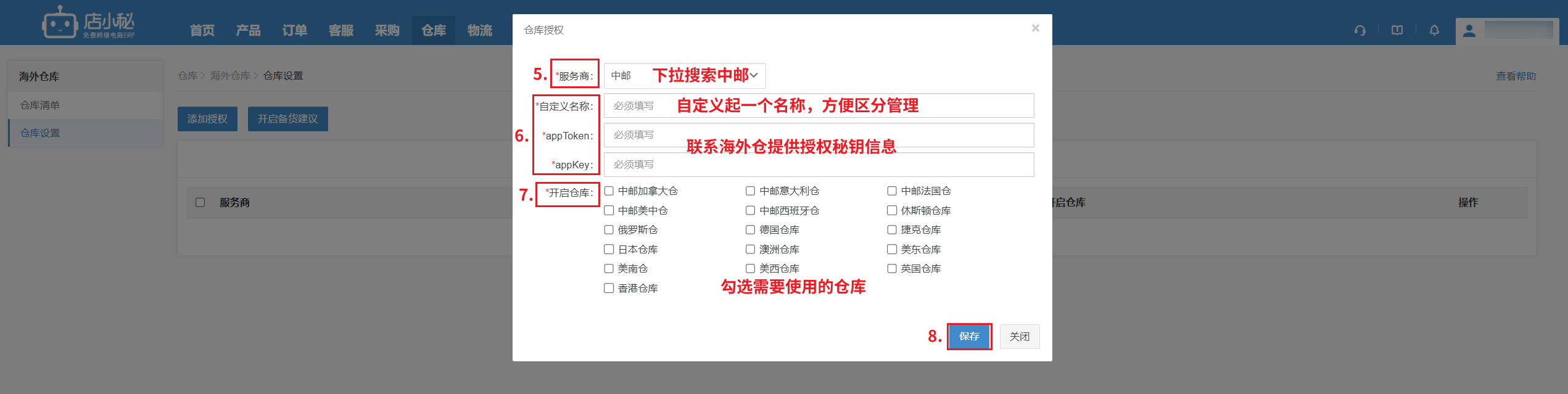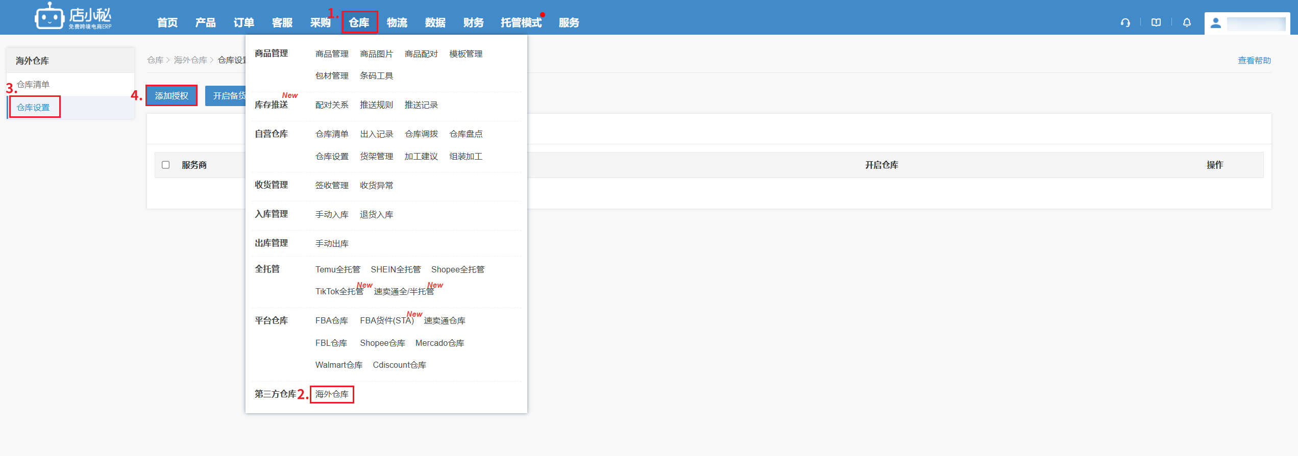 第一步:【仓库—海外仓库—仓库设置—添加授权—选择海外仓,例如“中邮”—勾选仓库—保存—完成授权】