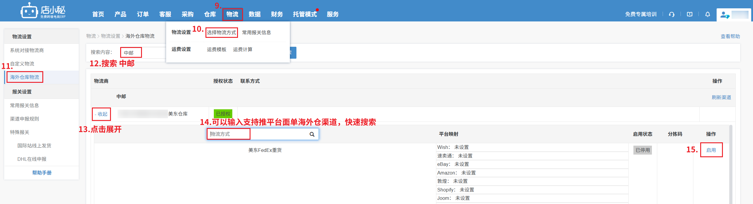 第二步:【物流—选择物流方式—海外仓仓库物流—找到对应启用的仓库—点击展开—搜索支持推送Temu面单的海外仓渠道名称