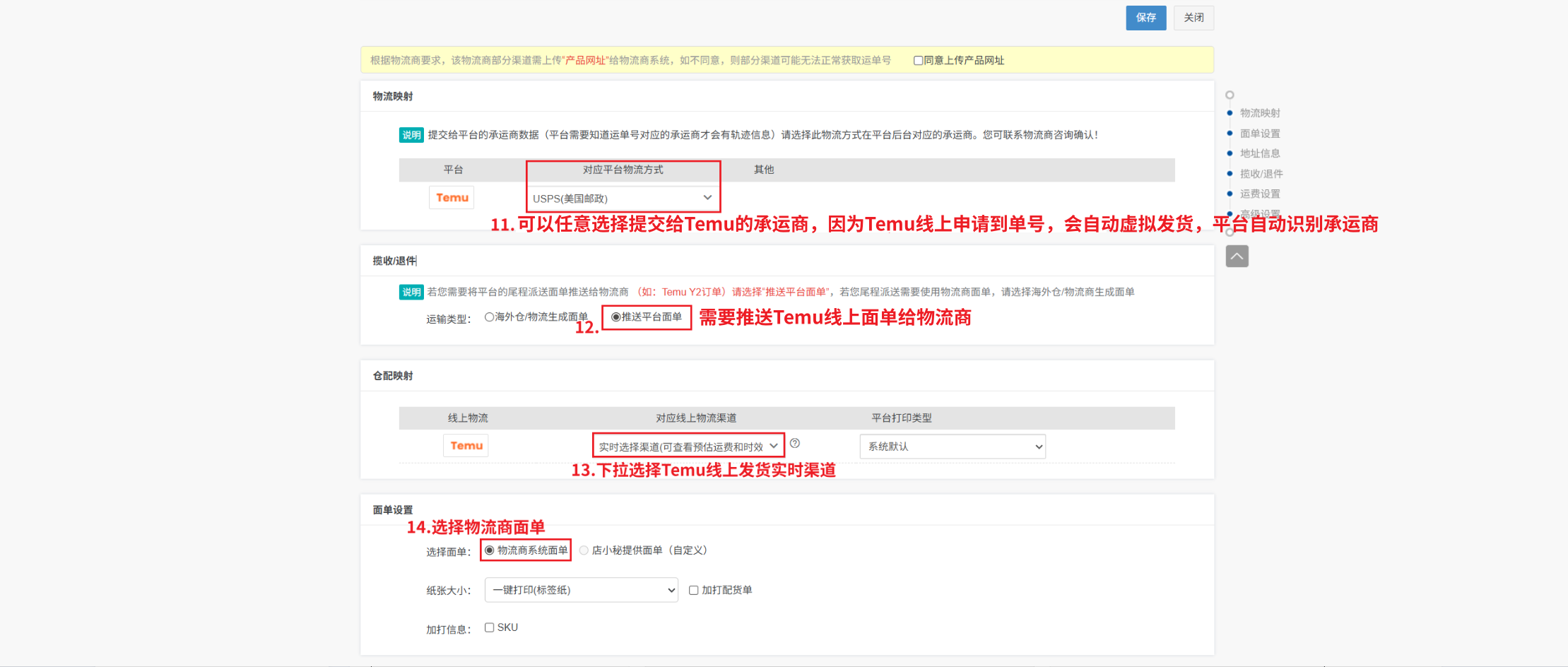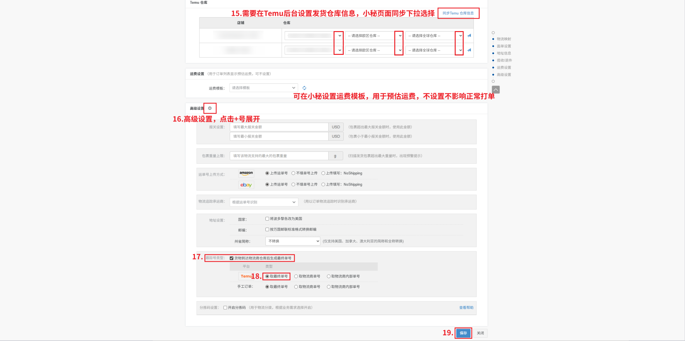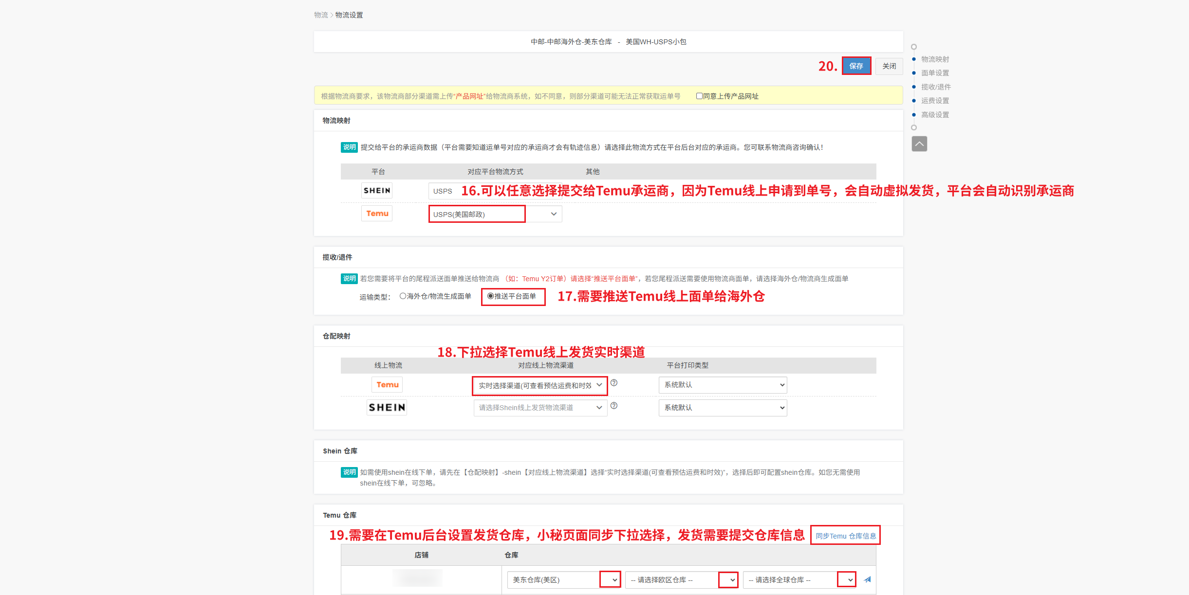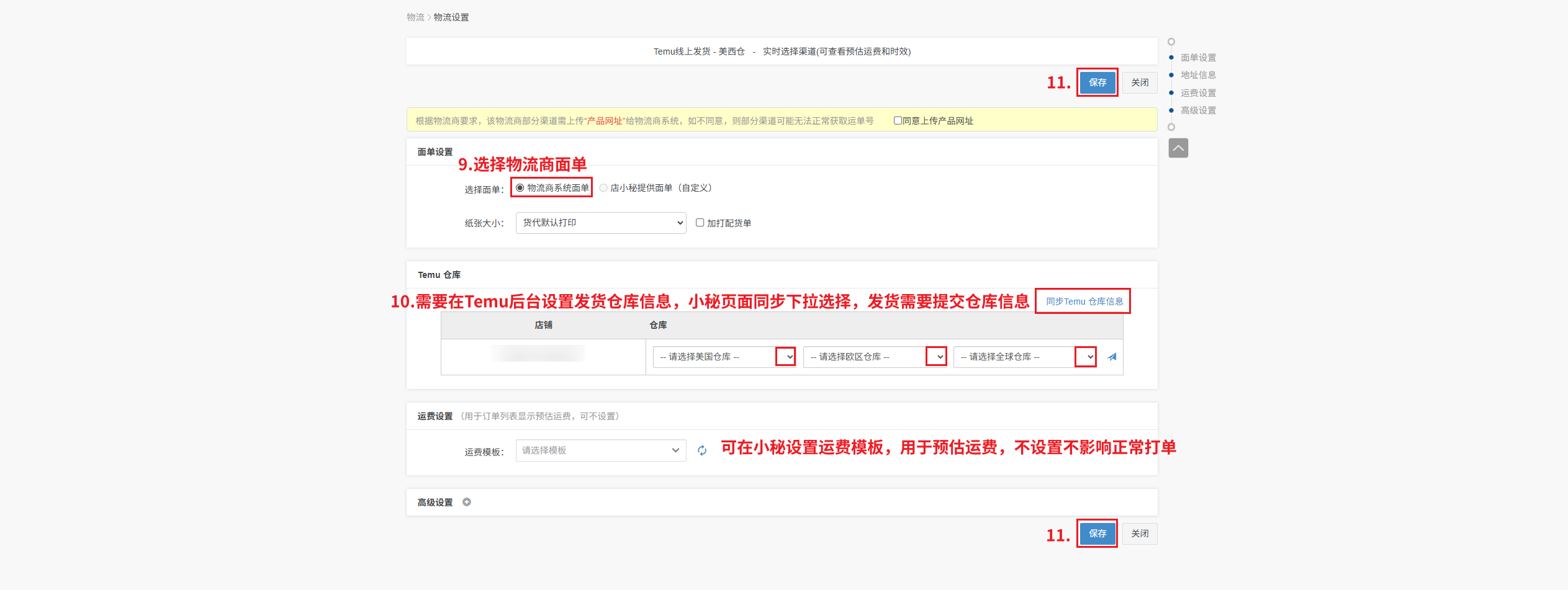 —仓配映射选择:实时选择渠道(可查看预估运费和时效)—完善物流设置—保存】