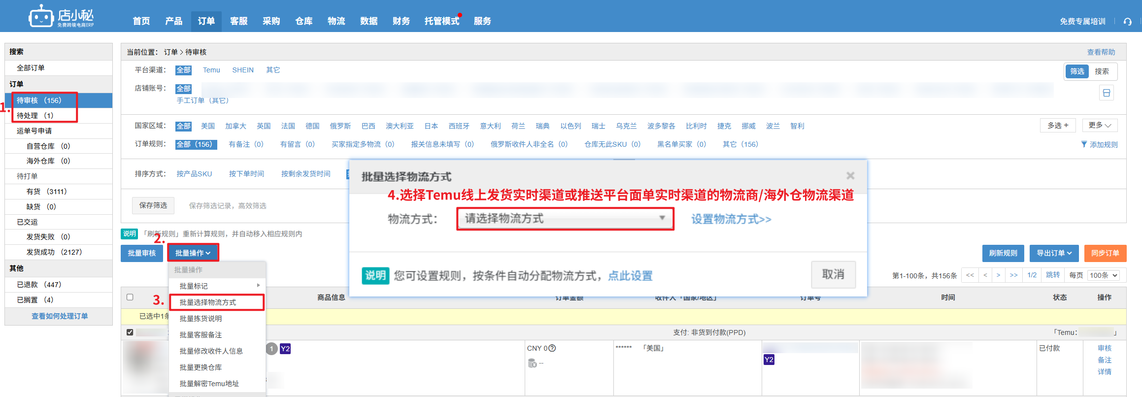 【待审核/待处理—批量操作—批量选择物流方式—选择Temu线上发货/物流商货代/海外仓渠道推平台面单的实时渠道