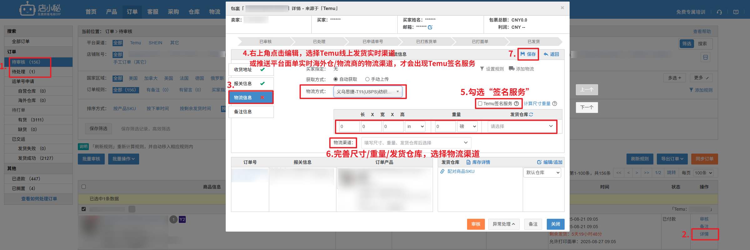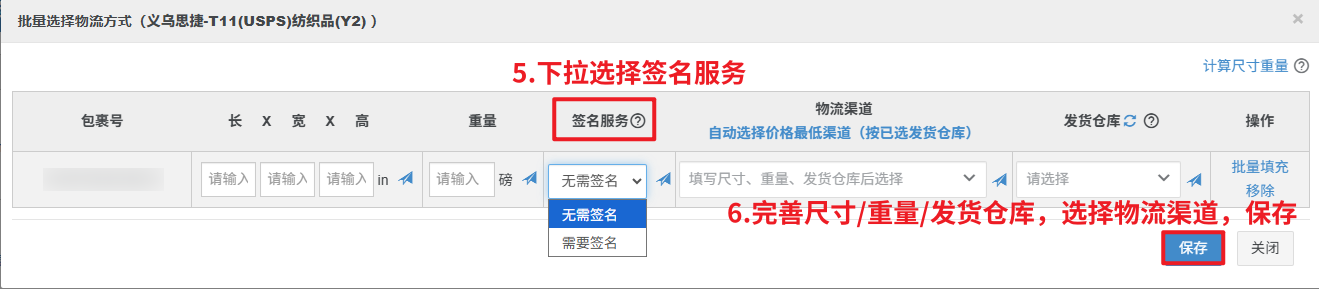 —勾选“签名服务”—填写尺寸/重量/发货仓库后,选择具体物流渠道—保存】