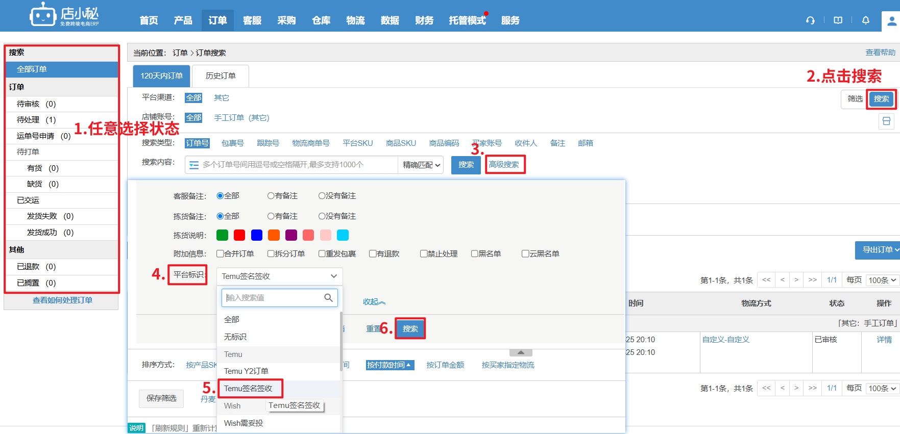 【订单任意状态—搜索—高级搜索—平台标识—下拉选择“Temu签名签收”—确定】