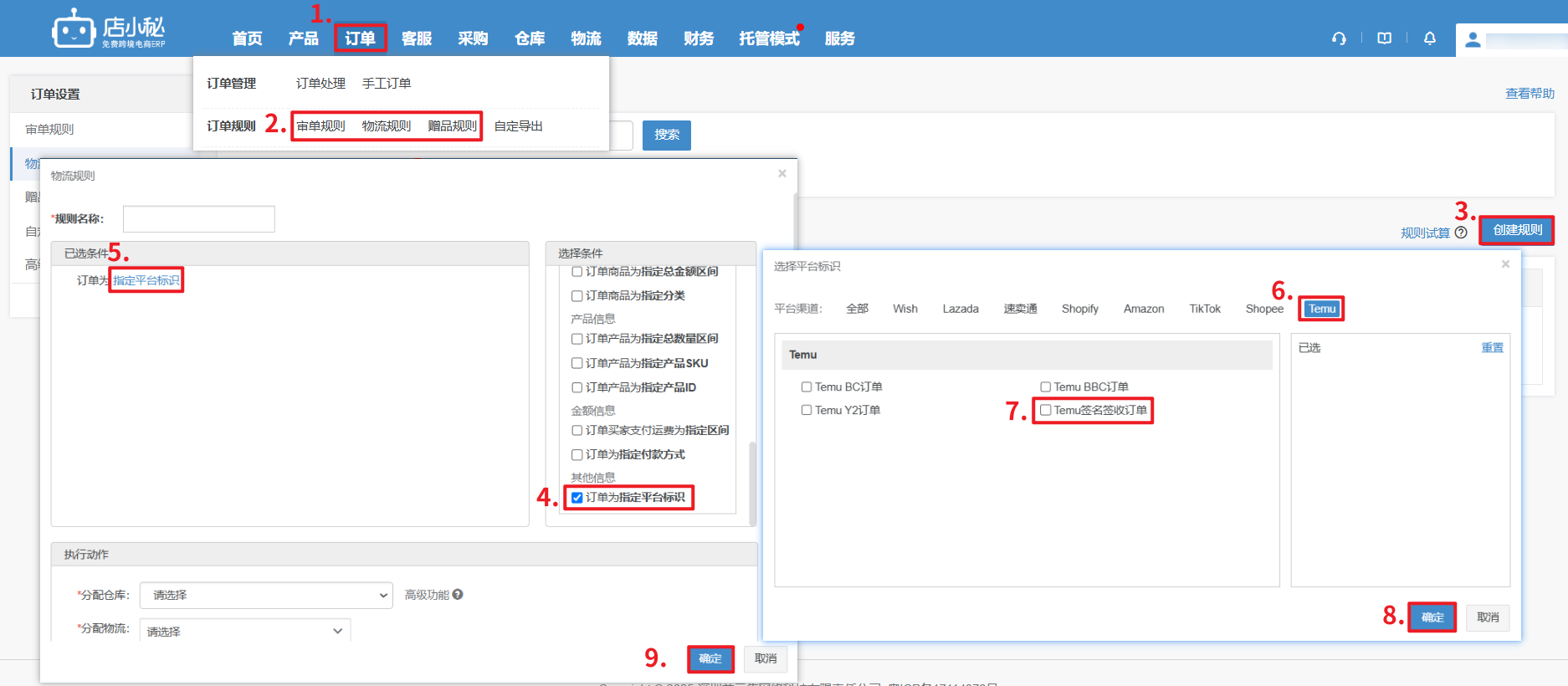 【订单—审单/物流/赠品规则—创建规则—勾选指定平台标识—点击蓝色字体—选择Temu平台—勾选“Temu签名签收的订单”—确定】