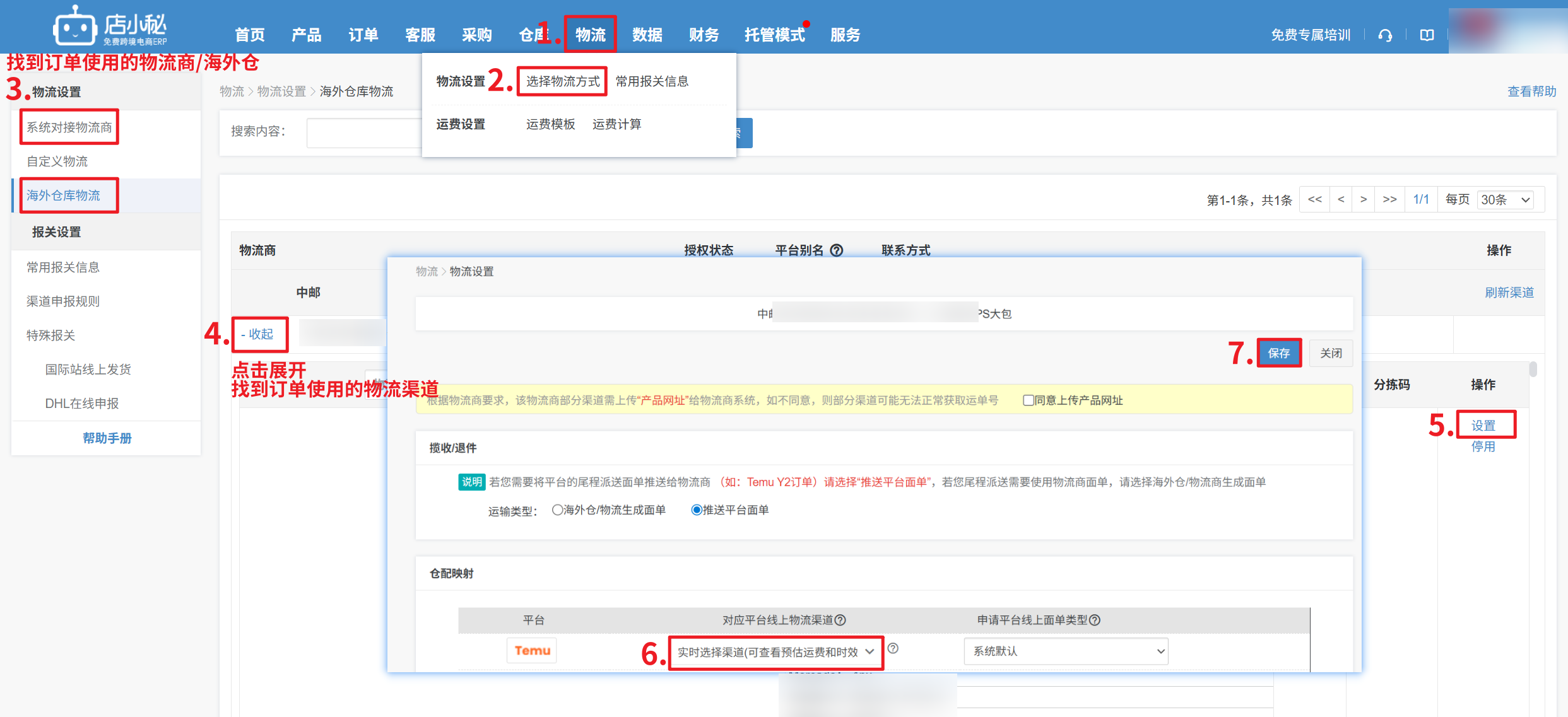 【物流—选择物流方式—系统对接物流商/海外仓库物流—点击展开—找到物流渠道—设置—仓配映射选择实时选择渠道—保存】