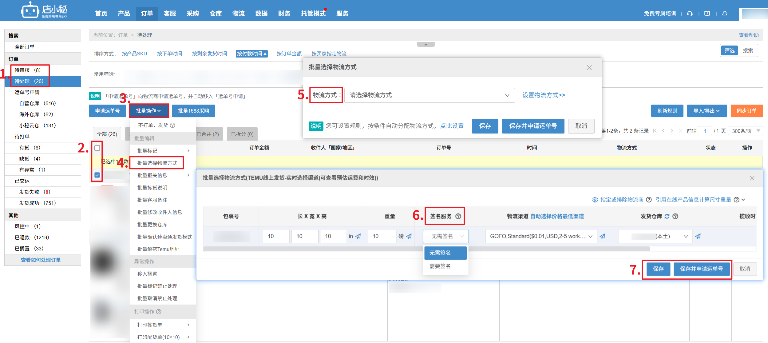【订单详情—物流信息—编辑—选择实时渠道—设置尺寸/重量/发货仓库—选择具体物流渠道—勾选签名服务—保存】
