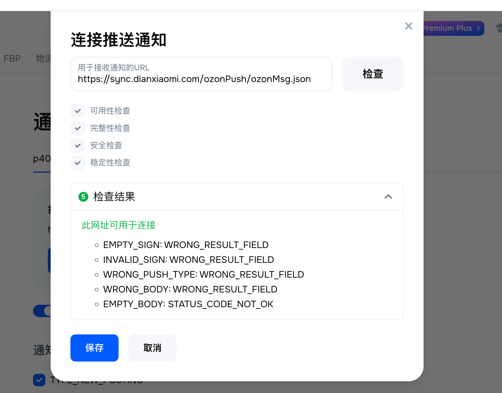 第二步:【连接推送通知弹窗中—复制填写店小秘ERP的消息推送链接地址:https://sync.dianxiaomi.com/ozonPush/ozonMsg.json