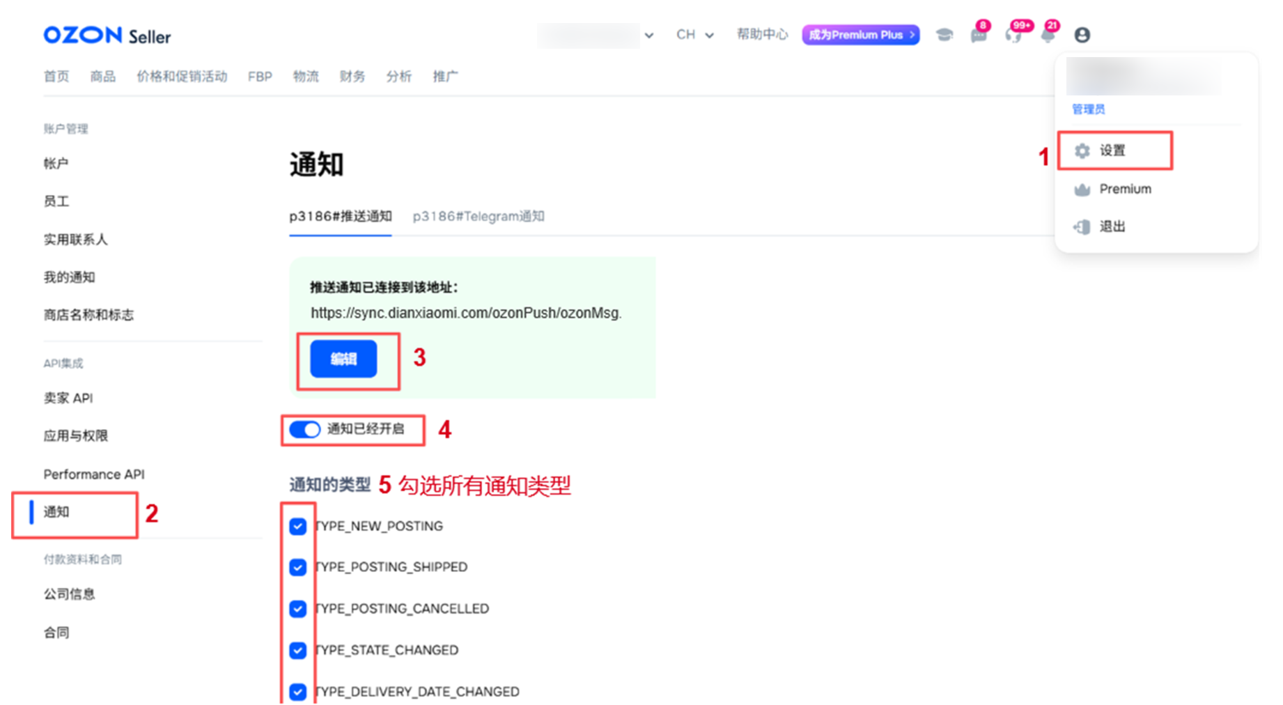 第一步:【登录Ozon商家后台—界面右上角个人头像—设置—通知—点击编辑或打开“通知已经开启”】