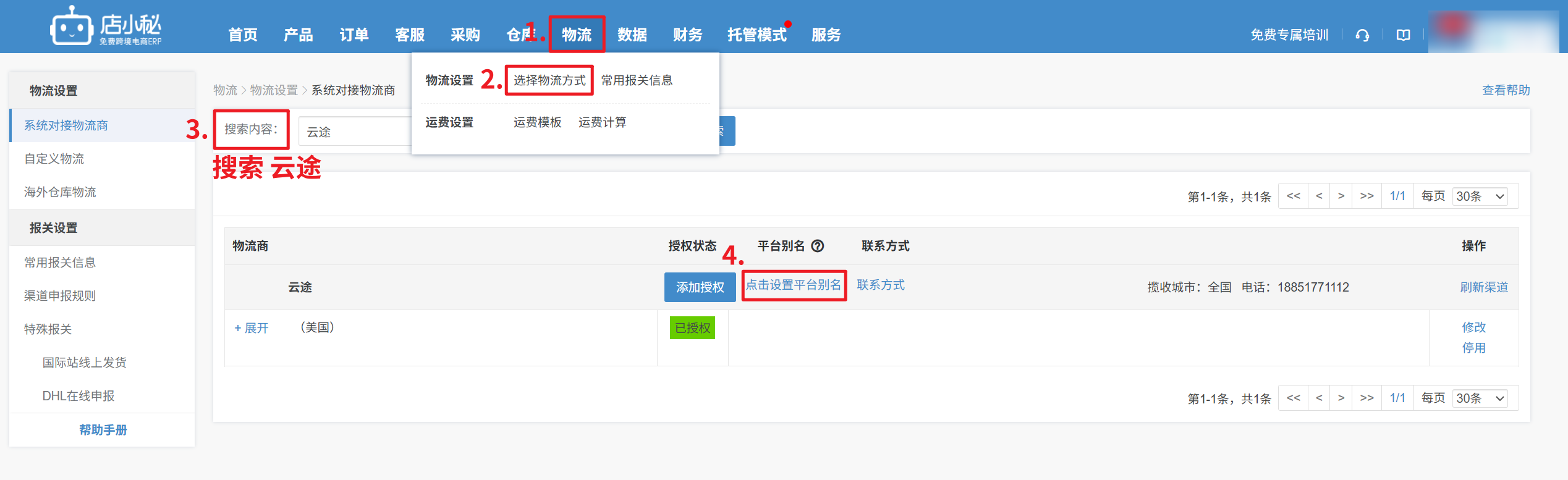 第一步:【物流—选择物流方式—搜索“云途”—点击设置平台别名】