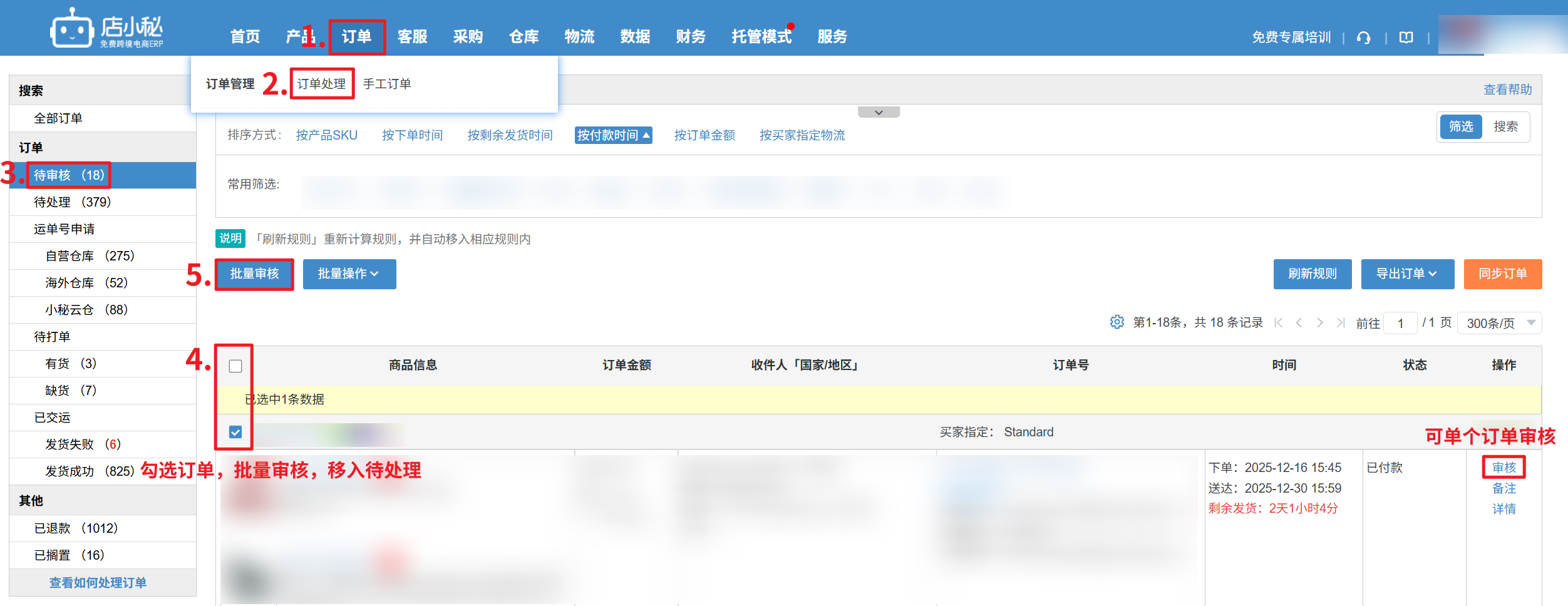 第一步:【订单—订单处理—待审核状态—勾选订单—单个/批量审核订单】