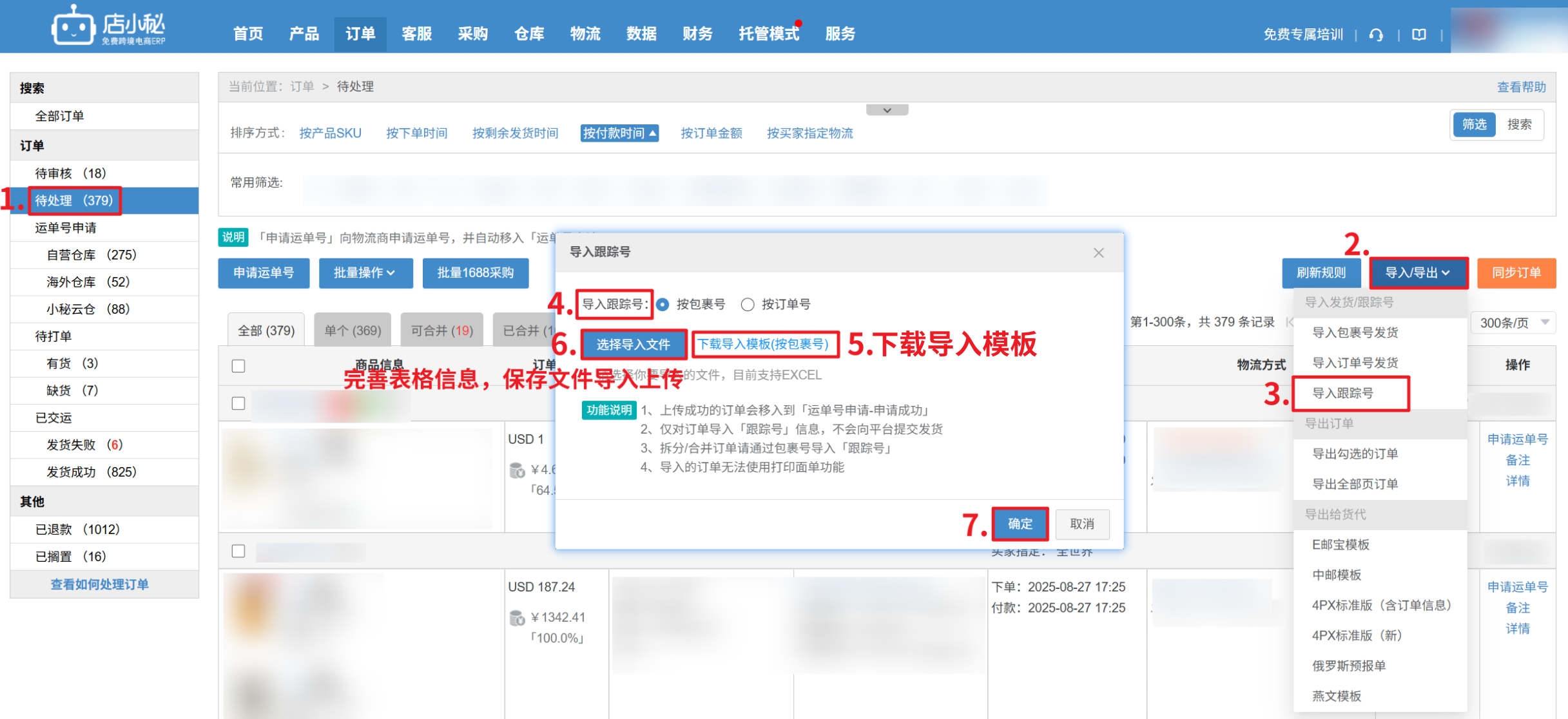 第二步:【待处理状态—导入/导出—导入跟踪号—下载导入模板—完善表格信息—选择文件导入上传—确定】