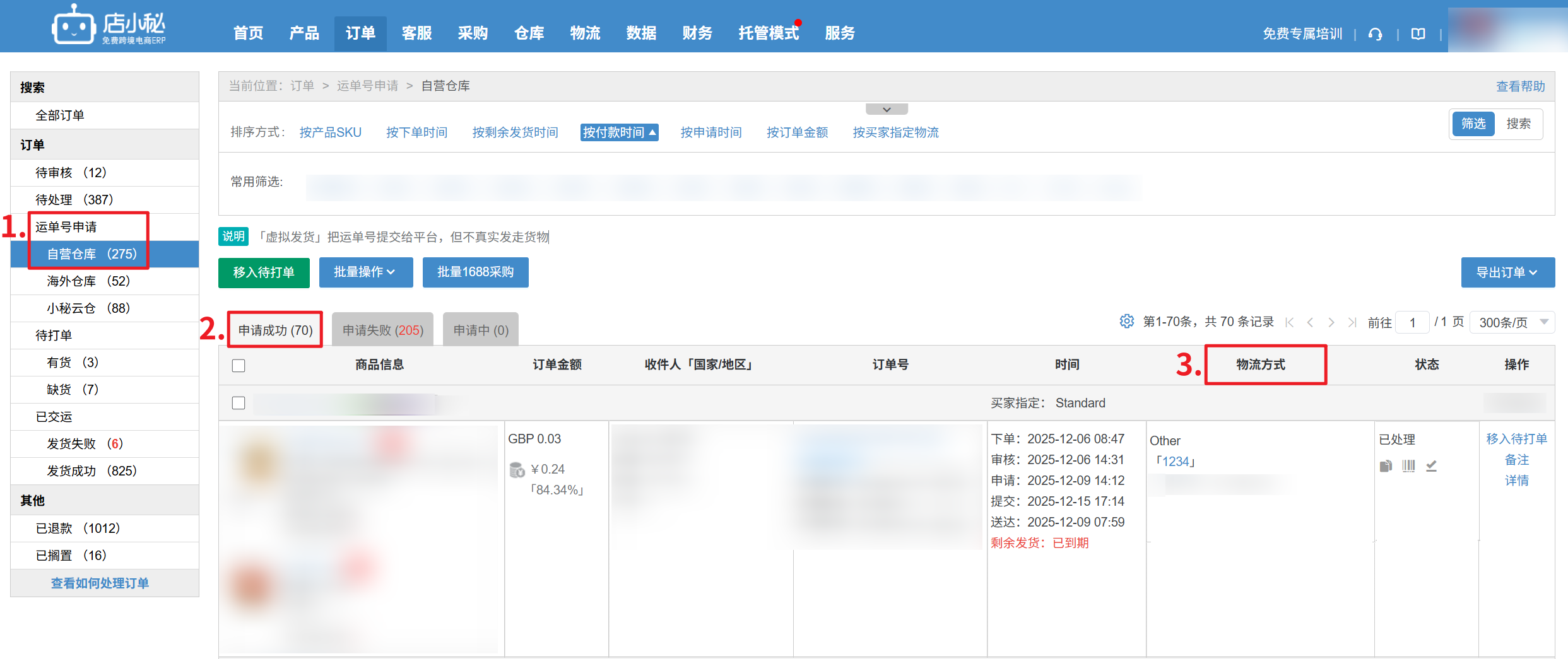 【5】若导入跟踪号成功,订单会进入【申请运单号—自营仓库—申请成功】