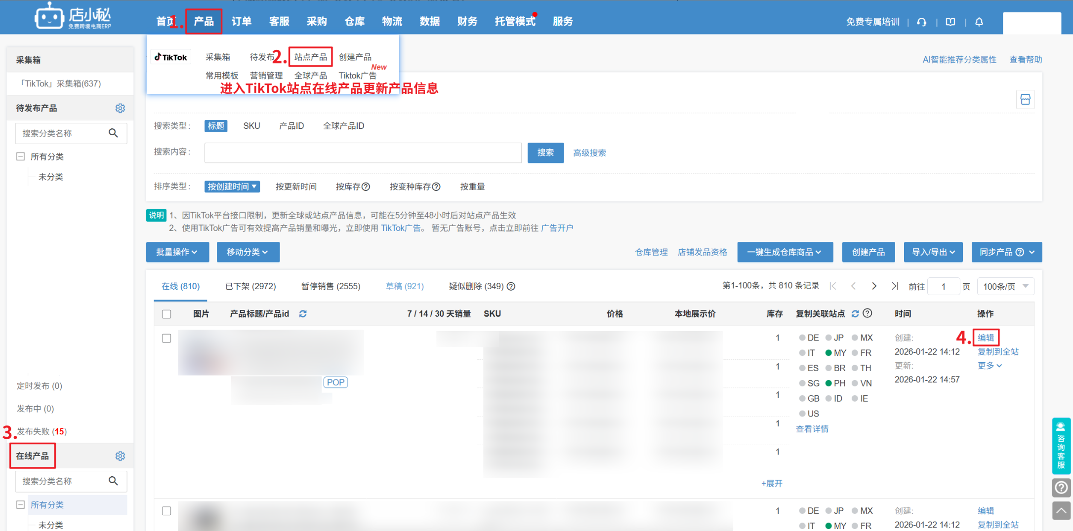 A4:TikTok店铺升级成POP模式,不支持通过全球更新在线产品信息,请到【产品—TikTok站点在线产品】更新修改