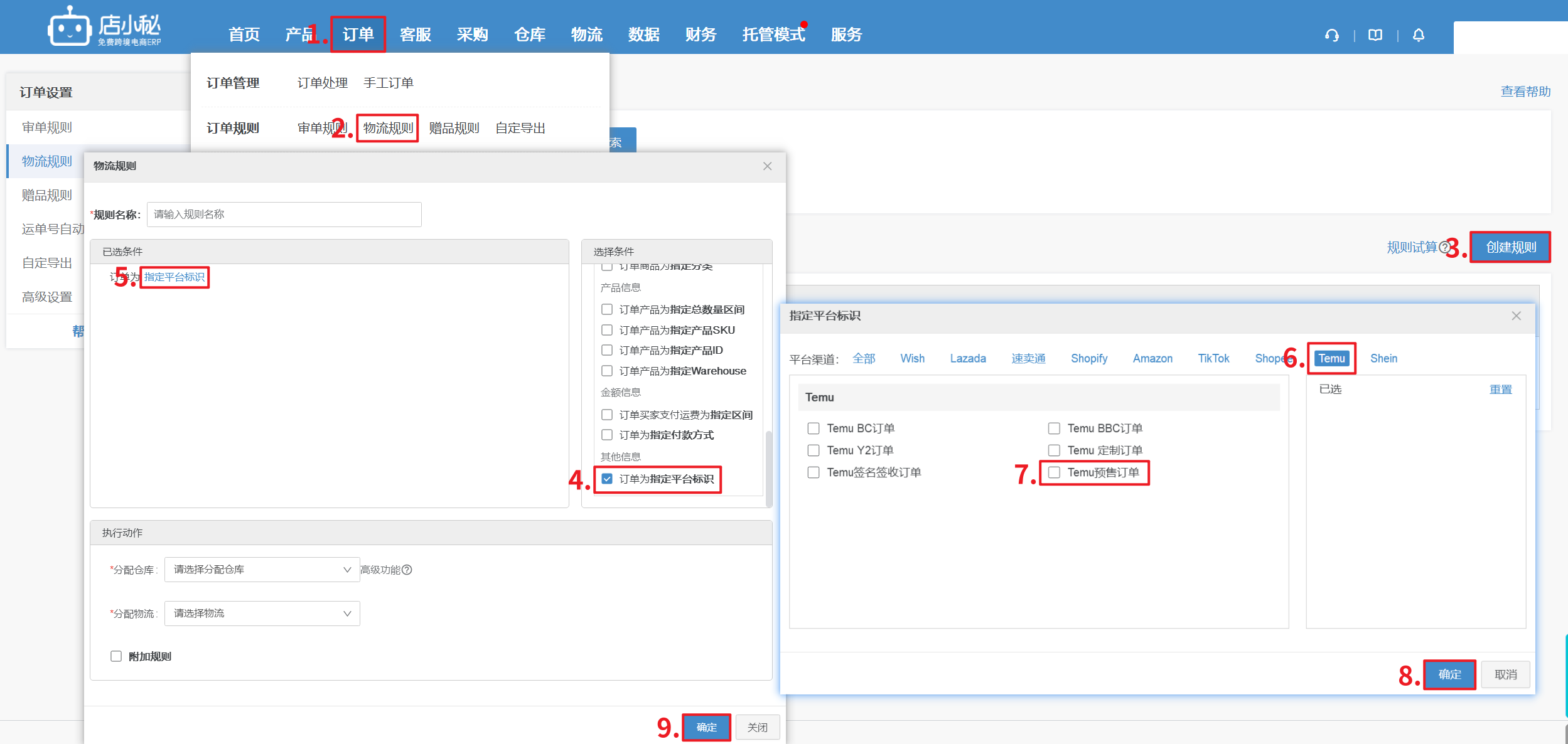【订单—审单/物流/赠品规则—创建规则—勾选指定平台标识—点击蓝色字体—选择Temu平台—勾选“Temu预售订单”—确定】