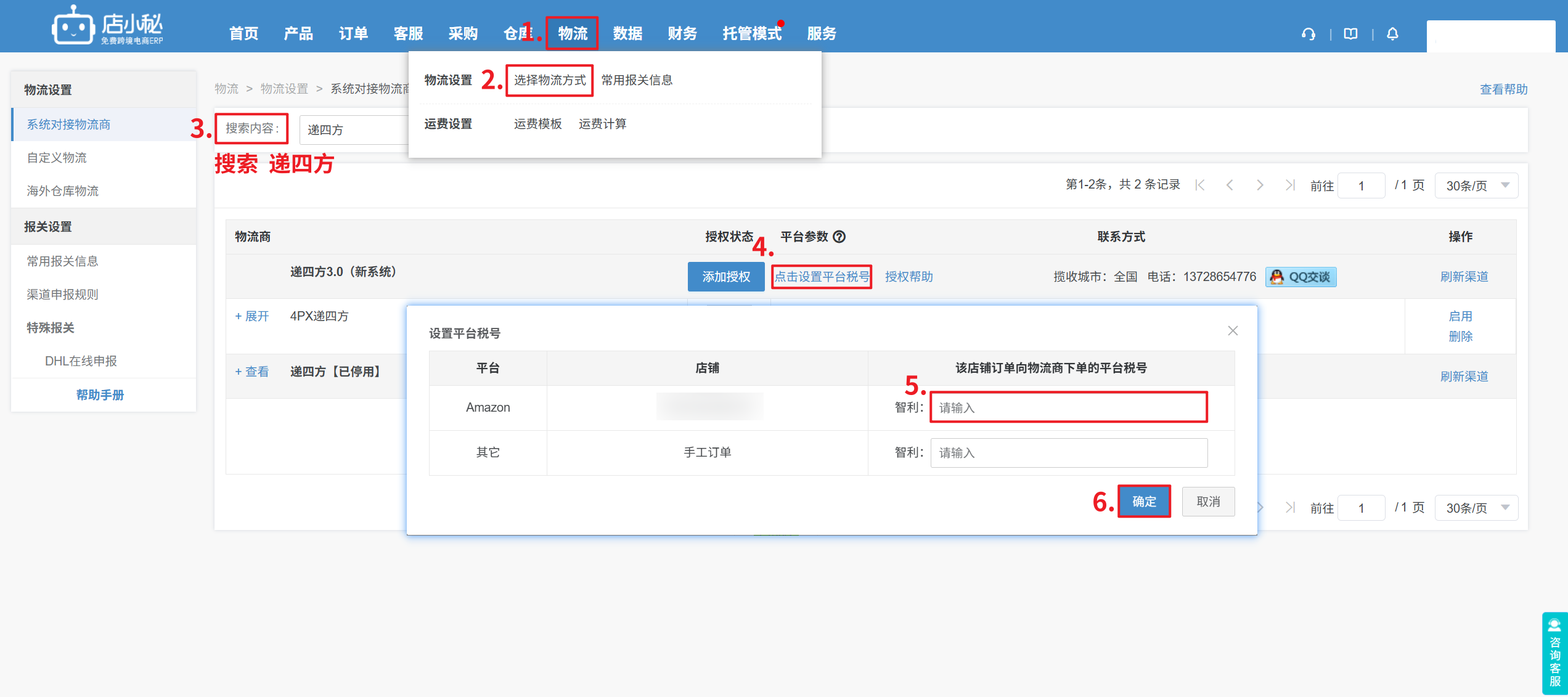 【物流—选择物流方式—搜索“递四方”—点击设置平台税号—找到对应店铺—填写税号—确定,订单选择物流渠道申请单号即可】
