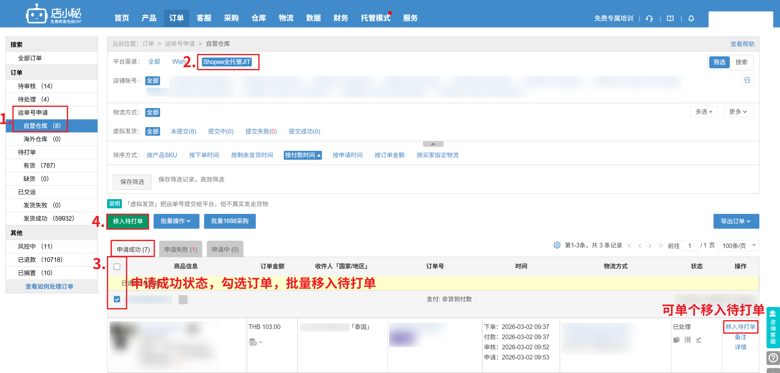 第三步:授权店铺、物流成功后,到订单页面处理Shopee全托管JIT直发订单