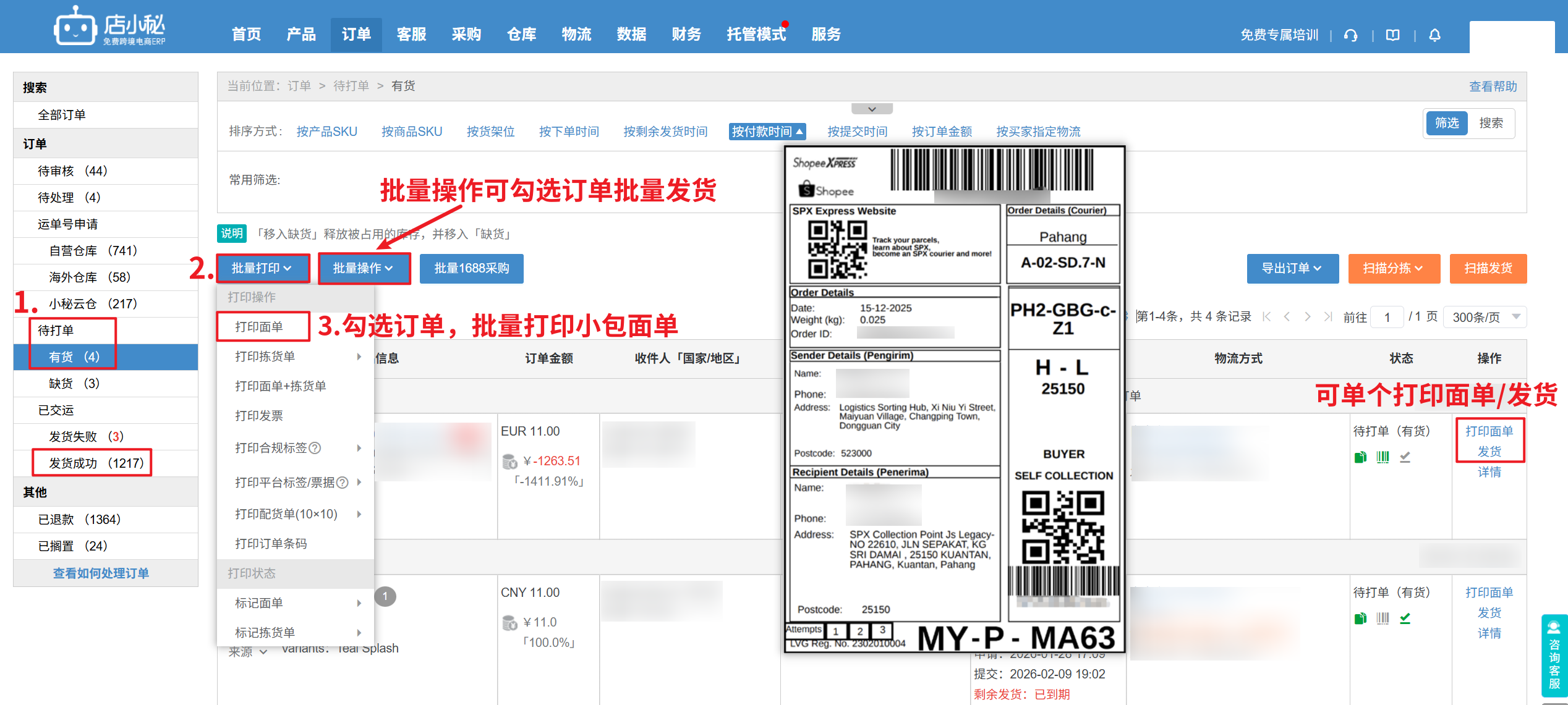 注意:平台接口限制,不返回Shopee全托管直发SOC拣货单,可以加打小秘拣货单或配货单,方便拣货