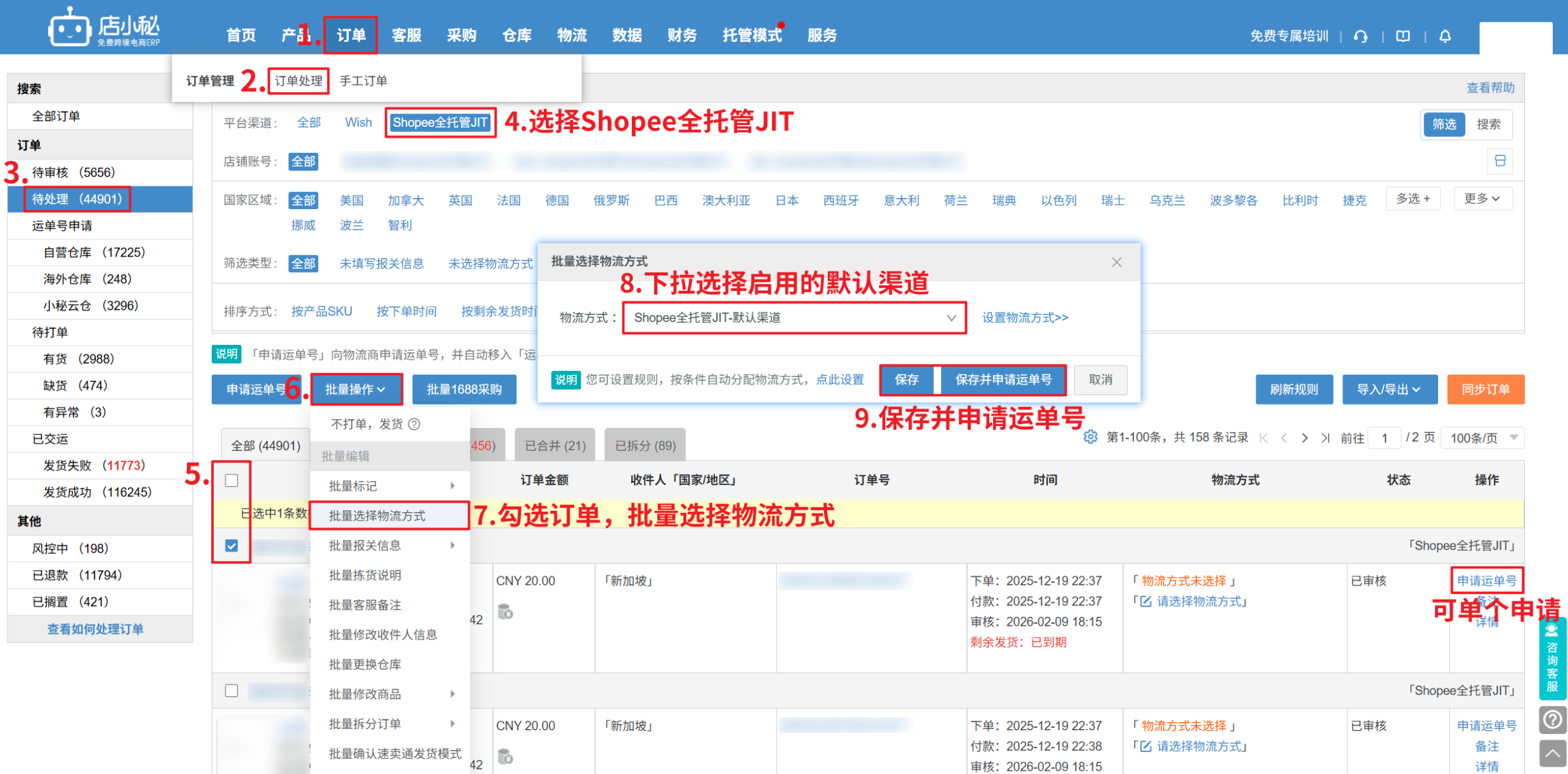 1、【待处理状态—批量选择物流方式—选择启用的Shopee全托管JIT线上默认渠道—申请单号—进入运单号申请】