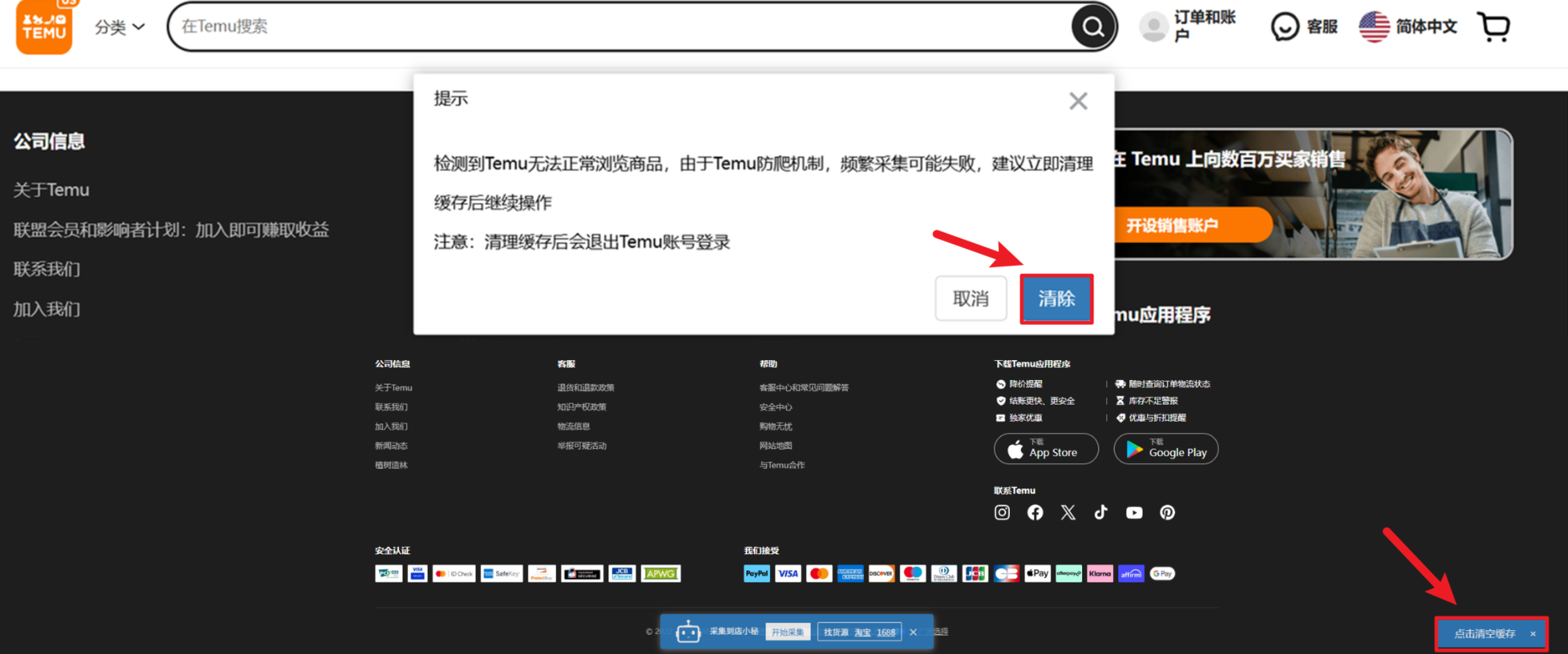 注意:清理缓存后会退出Temu账号,需要重新登录