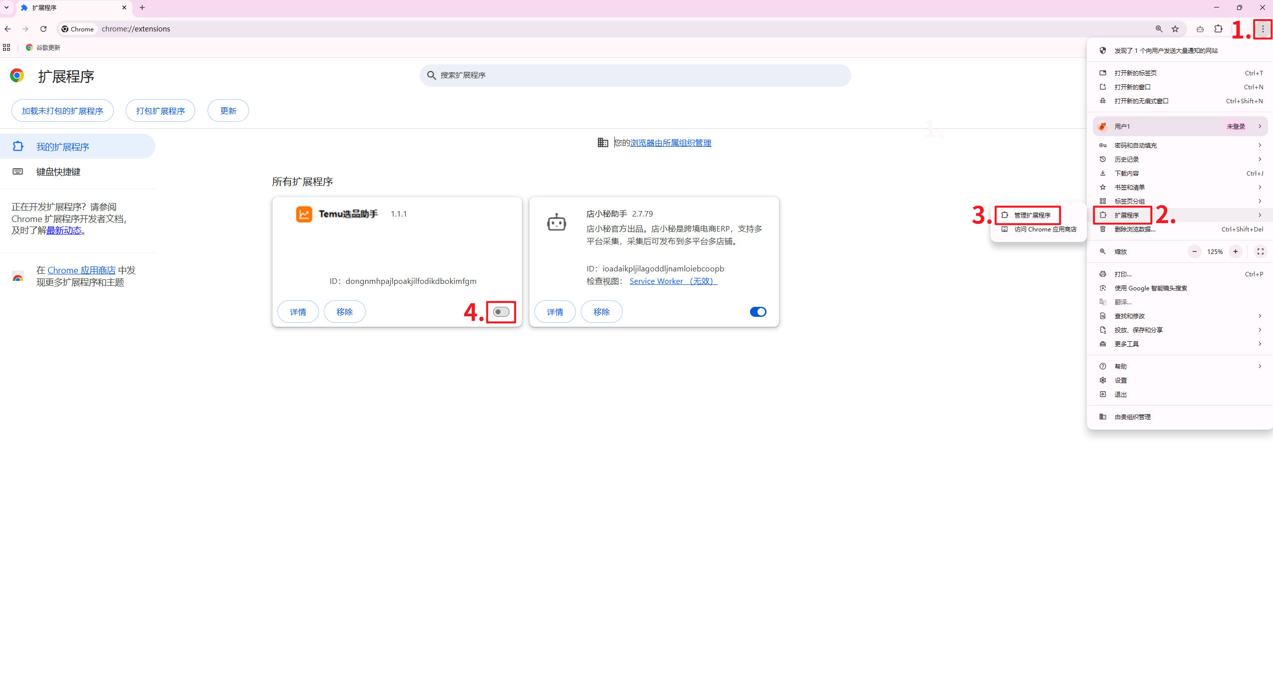 4、检查浏览器是否安装了Temu选品助手插件,关闭后再刷新页面重新进行采集